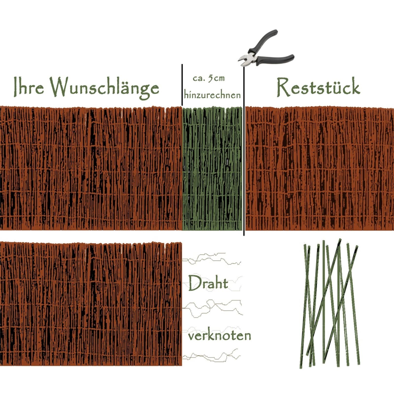 Bei der Abdeckung eines bestimmten Elements sollte die Weidenmatte nicht über dieses überstehen, da sie sonst durch Wind oder Regen entlang der Kante brechen kann. Passen Sie die Matte also immer genau an die Höhe von Zaun, Geländer, etc. an.