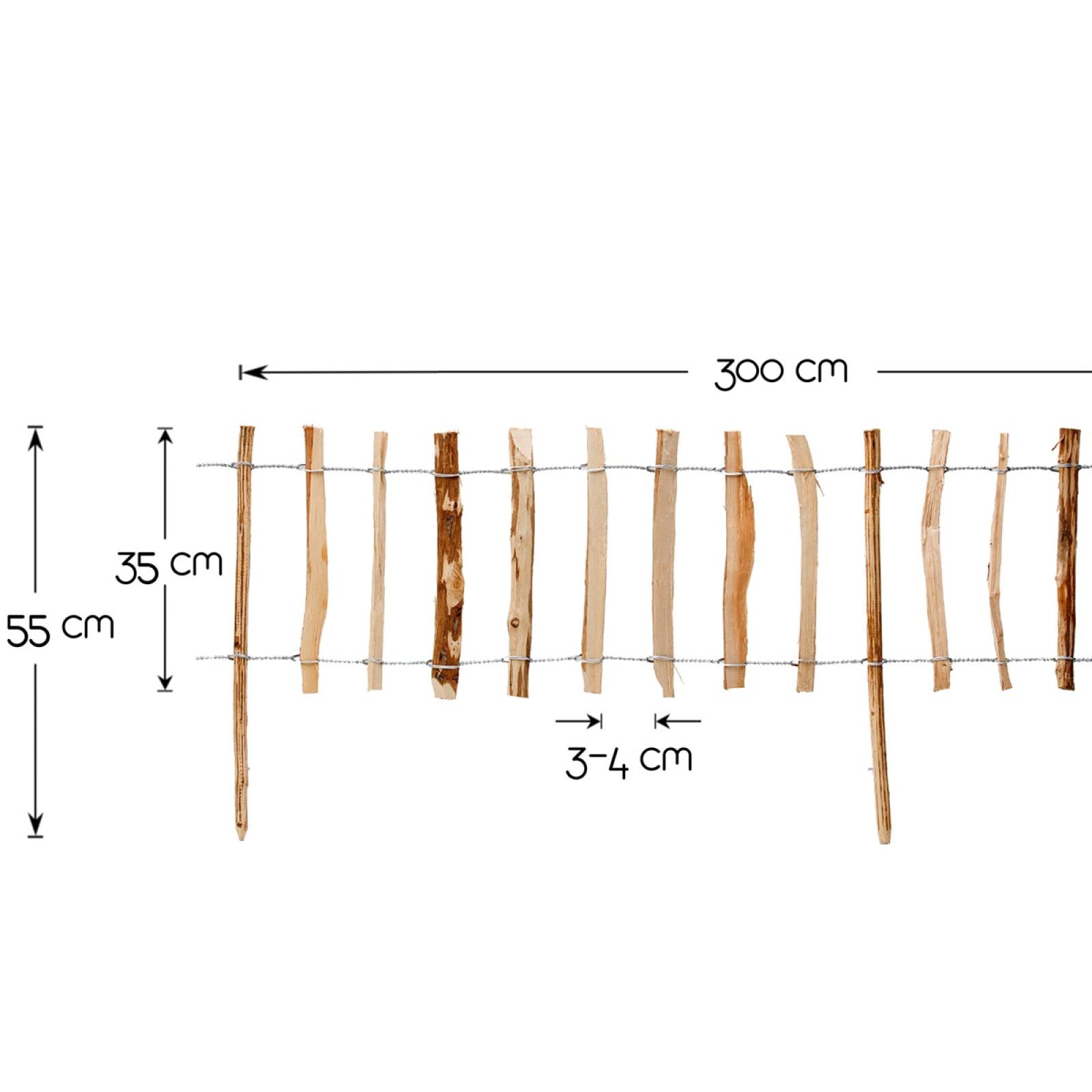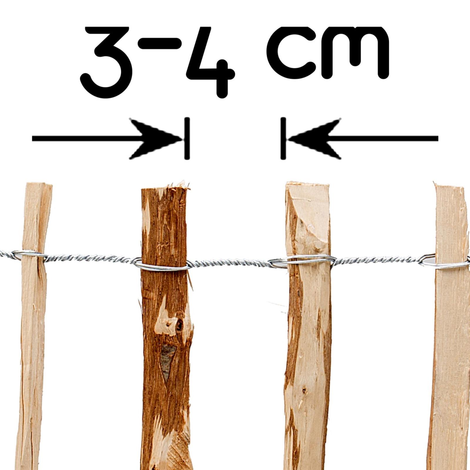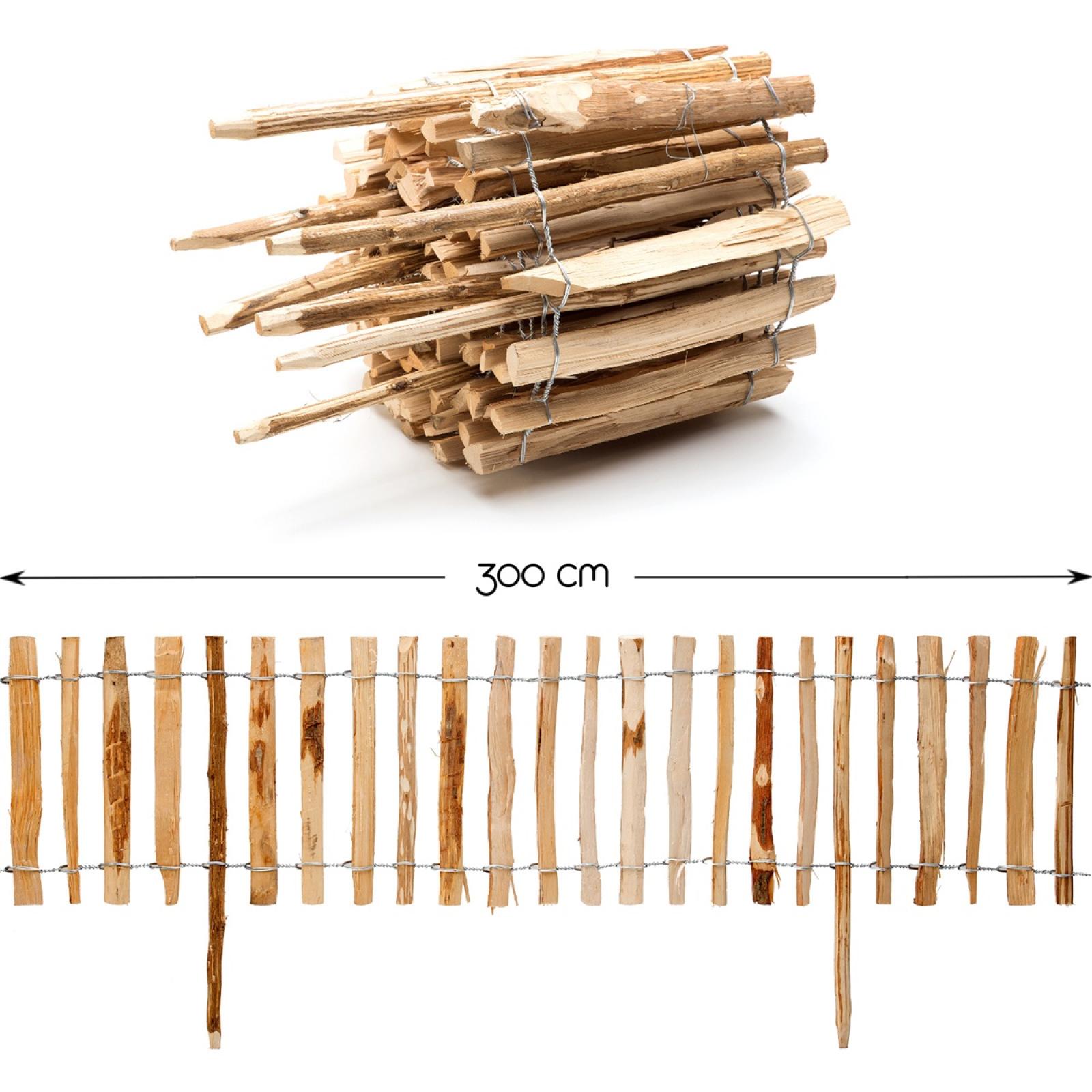 Die Spitzen der Holzlatten sind nach oben hin nicht angespitzt, was für ein Höchstmaß an Sicherheit und eine einladende Optik sorgt. Die Verspannung des Steckzauns besteht aus einem starren, verzinkten Drahtgeflecht, welches für die nötige Stabilität sorgt und eine optimale Formbarkeit ermöglicht. So können Sie ohne zusätzliche Fixierung auch kreisrunde, wellenförmige und eckige Abgrenzungen sehr unkompliziert realisieren. Obwohl das Holz unbehandelt ist, besitzt es eine stolze Haltbarkeit, sodass Sie an Ihrem Rollzaun lange Freude haben werden.