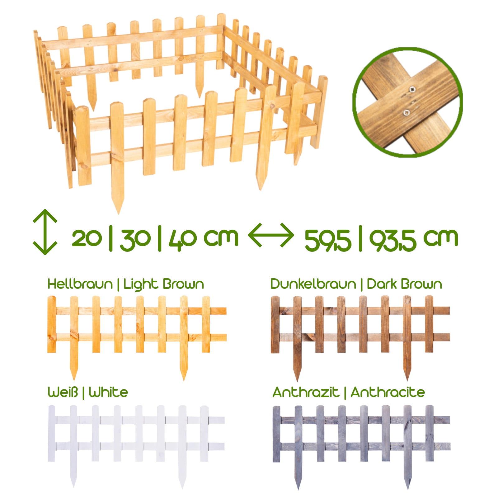 Unsere Beetzäune aus Holz sind eine ansprechende Idee um Ihrem Garten einen neuen Anstrich zu verpassen. Die Steckzäune sorgen für eine optische Trennung der verschiedenen Bereiche und damit für eine klare Struktur in Ihrer Gartenanlage. Sie können Ihre Blumenbeete einzäunen, den Rasen abgrenzen oder Bäume rechteckig einfassen. Die Beeteinfassungen zum Stecken bieten Ihnen vielerlei Verwendungsmöglichkeiten. Selbst um kleine Tiere wie Schildkröten oder Kaninchen im Sommer an der frischen Luft zu halten, können sie verwendet werden. Natürlich können Sie auch Ihr Obst-und Gemüse vor Vögeln schützen, indem Sie ein entsprechendes Netz über die Zäune spannen. Mit den Mini-Zäunen lassen sich auch schöne farbliche Kontraste erschaffen.