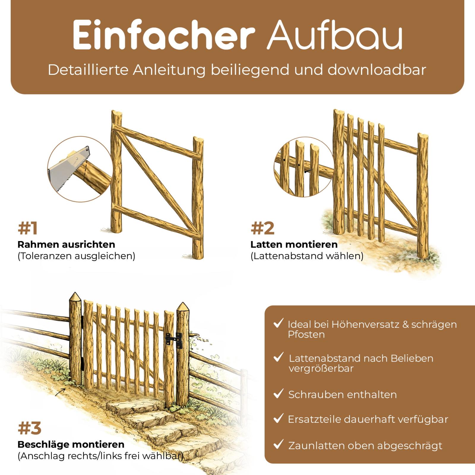 Das Zubehör ist so gestaltet, dass Sie selbst entscheiden, ob das Tor nach links oder rechts öffnen soll. Da jeder Kunde verschiedene Pfosten verwendet (Holz, Metall oder Beton), liegen die passenden Schrauben für die Verschlussfalle, Kloben und die Ladenbänder nicht bei.