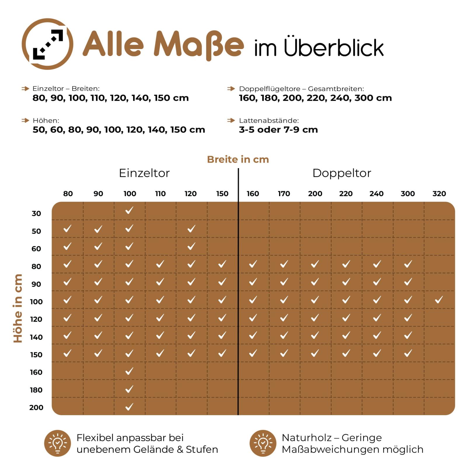 Nun haben Sie die Möglichkeit Ihr individuelles Holztor in Ihren gewünschten Maßen zu erschaffen und die Richtung der Öffnung selbst zu wählen!