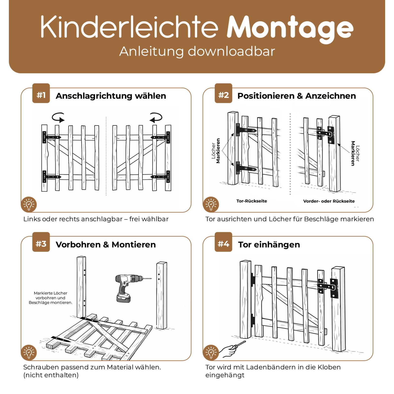 Unser Zubehör ist so gestaltet, dass Sie selbst entscheiden, ob das Tor nach links oder rechts öffnen soll. Da die Anforderungen an die benötigten Schrauben von Kunde zu Kunde sehr verschieden sind, liegen diese nicht bei. Ab der Höhe 120cm versenden wir Ihr Gartentor per Spedition. Um einen Anliefertermin mit Ihnen zu vereinbaren, benötigt unsere Spedition eine Telefonnummer. Bitte geben Sie diese während des Kaufprozesses an.