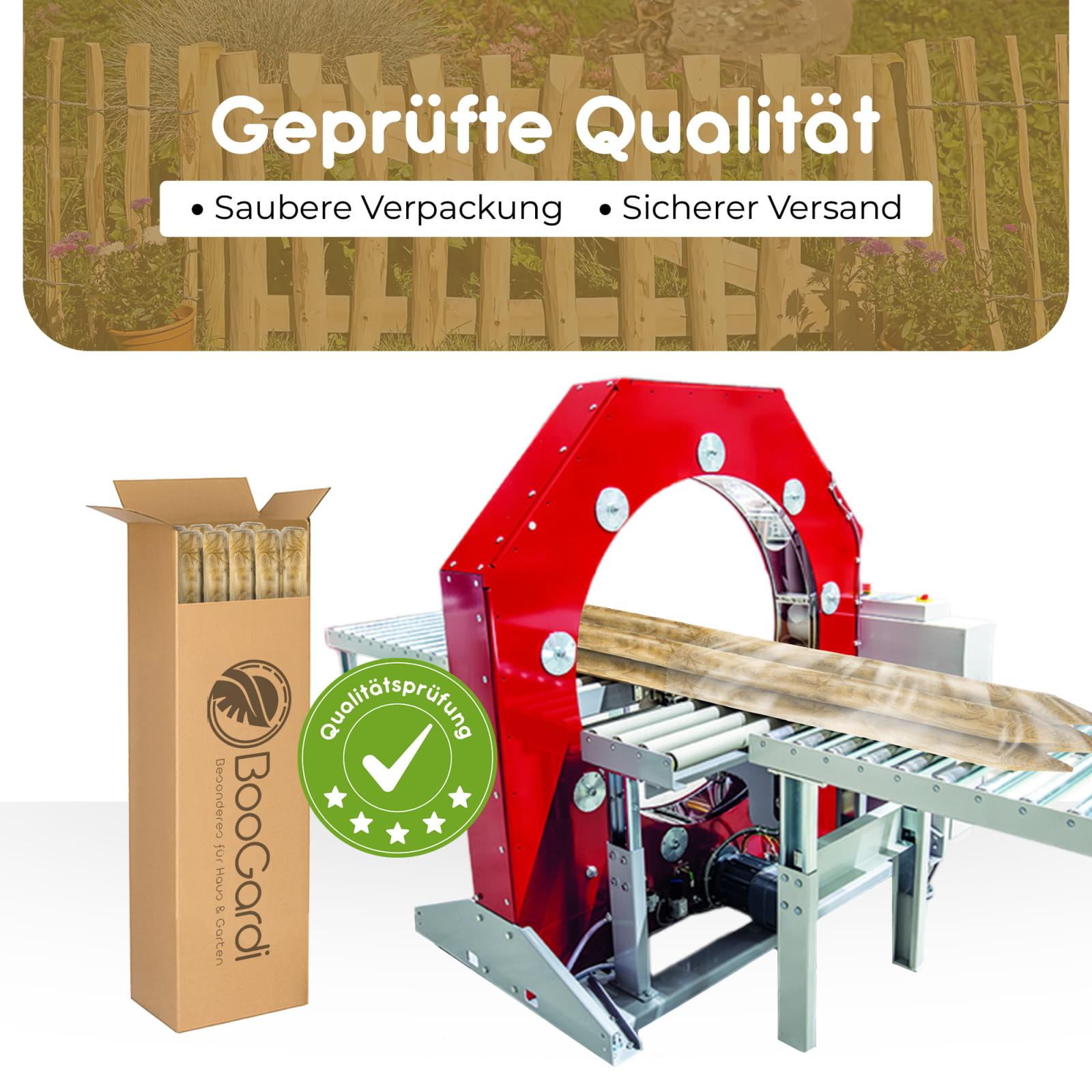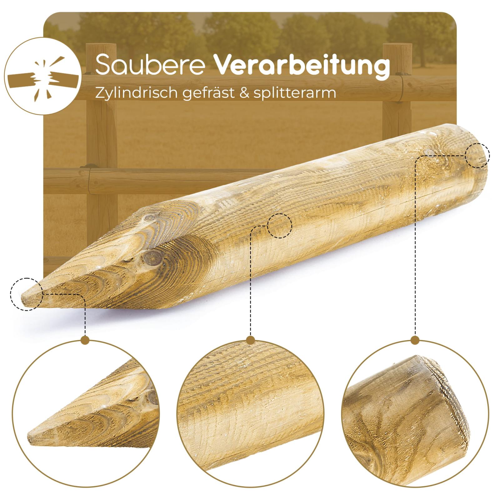 Die Kesseldruckimprägnierung macht unsere Pfosten widerstandsfähig gegen Witterung /Schädlinge und sorgt somit dafür, dass Sie lange Freude an unseren Mini-Palisaden und Baumpfählen haben. Durch die Imprägnierung weisen die Palisaden anfangs einen grünlichen Farbton auf - nach wenigen Wochen verblasst dieser und die natürliche gräulich-braune Holzfarbe kommt zum Vorschein. Die Palisaden sind angespitzt, sodass Sie diese ganz leicht in den Boden einschlagen können. Die Kopffase (ringsherum abgeschrägter Kopf) sorgt für eine schöne und splitterfreie Optik.
