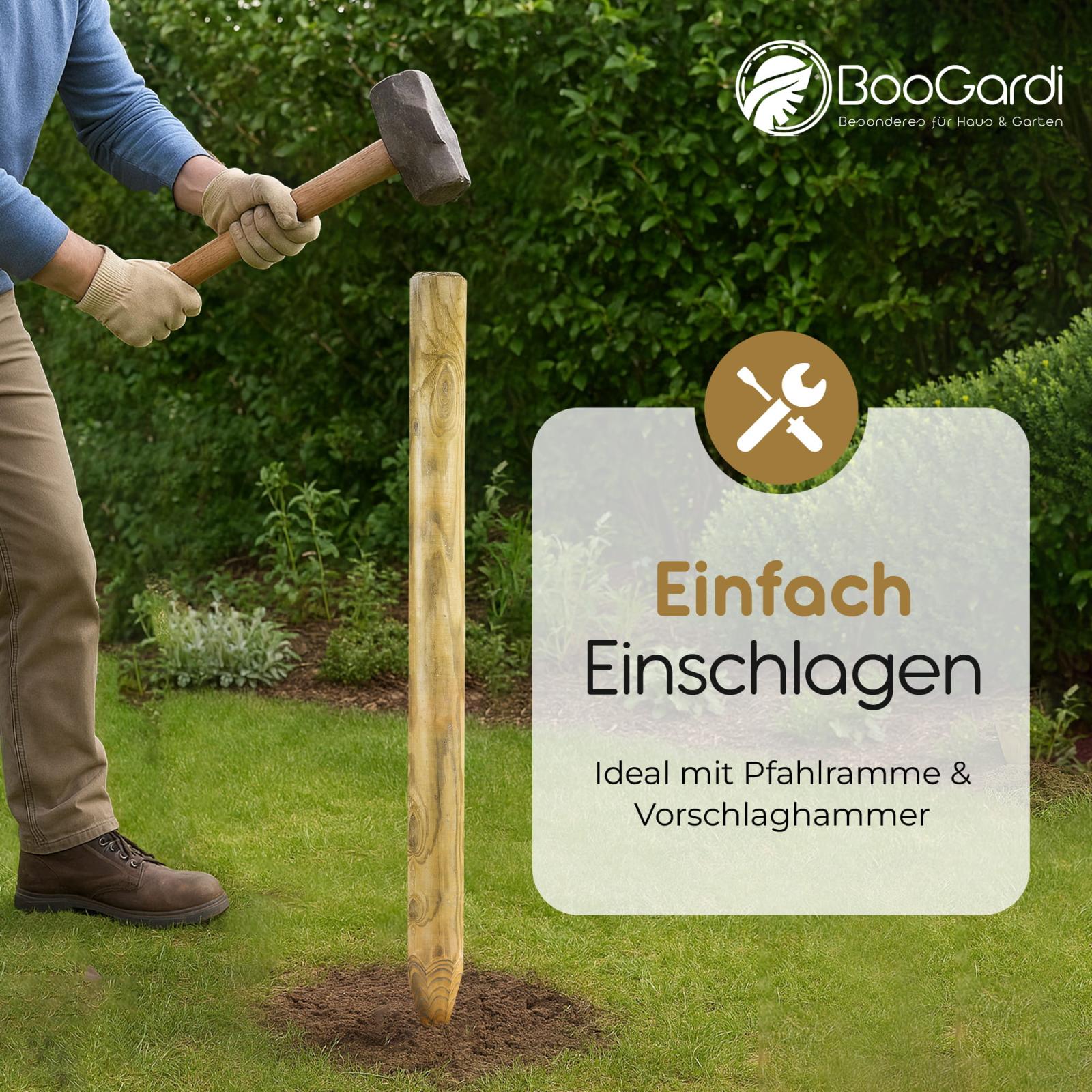 Um eine einheitliche Einfriedung zu erhalten, stechen Sie vor dem Einschlagen der Pfosten die Strecke mit einem Spaten ab. So gewährleisten Sie, dass die Palisaden in einer Flucht eingeschlagen werden können und vermeiden zusätzlich ein Spalten/Reißen der Palisaden. Nutzen Sie zum Einschlagen einen großen Gummihammer - falls Sie nur einen herkömmlichen Hammer zur Hand haben, nutzen Sie ein Zwischenbrett, um die Hammerschläge abzufangen bzw. die Palisade beim Einschlagen nicht zu beschädigen.