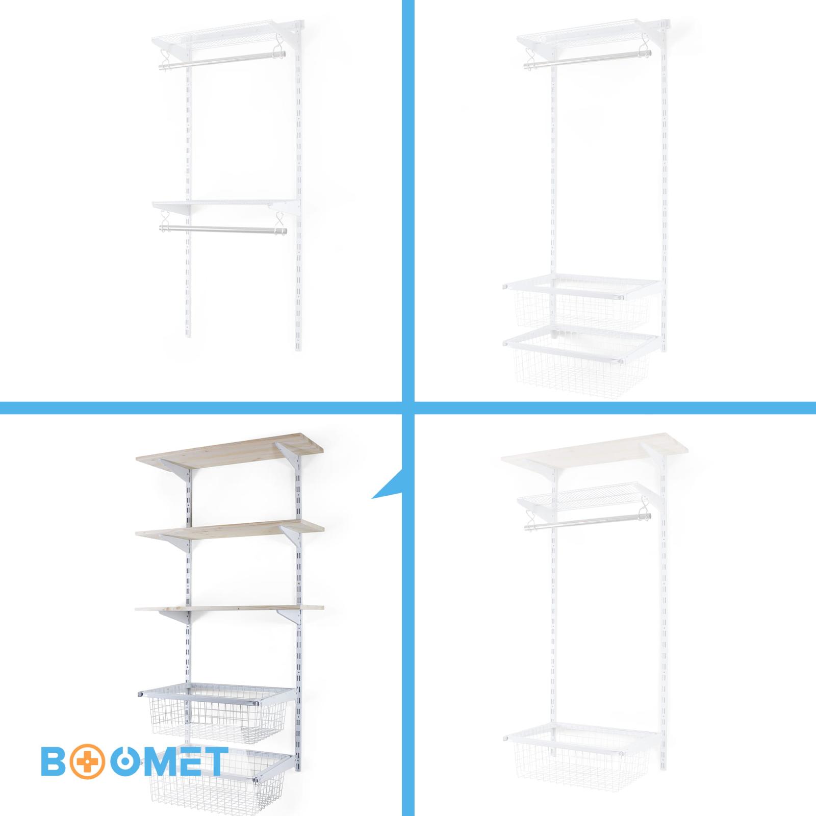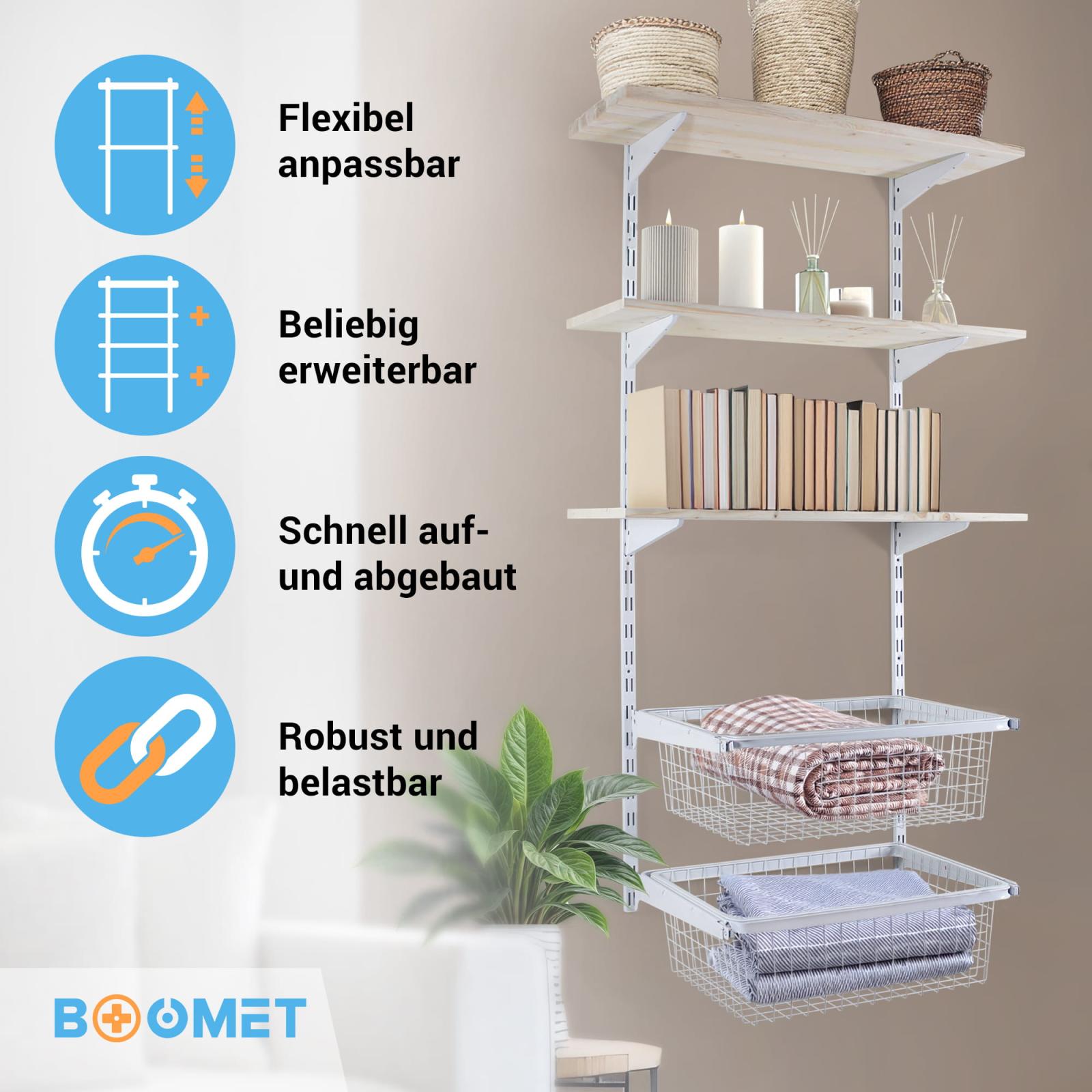 Das BOOMET Kleiderschrank-Bausatz Modul Storage ist die ideale Lösung, wenn es darum geht, viel Stauraum auf wenig Platz zu schaffen. Durch die Kombination aus festen Ablagen und ausziehbaren Körben eignet es sich besonders für offene Kleiderschränke, Garderoben oder begehbare Schranksysteme.