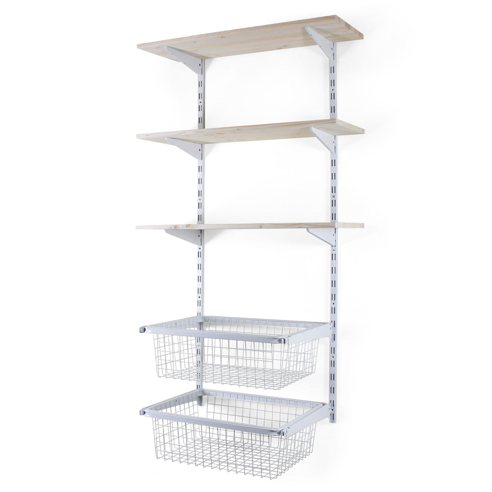 In der oberen Hälfte sorgen drei Echtholz-Regalböden für stabile Ablageflächen, die sich ideal für Kleidung, Boxen oder Accessoires eignen. In der unteren Hälfte schaffen zwei ausziehbare Drahtkörbe zusätzlichen Stauraum, der leicht zugänglich und übersichtlich bleibt. Damit bietet das Modul Storage eine platzsparende Möglichkeit, Kleidung und Utensilien effizient zu organisieren.
