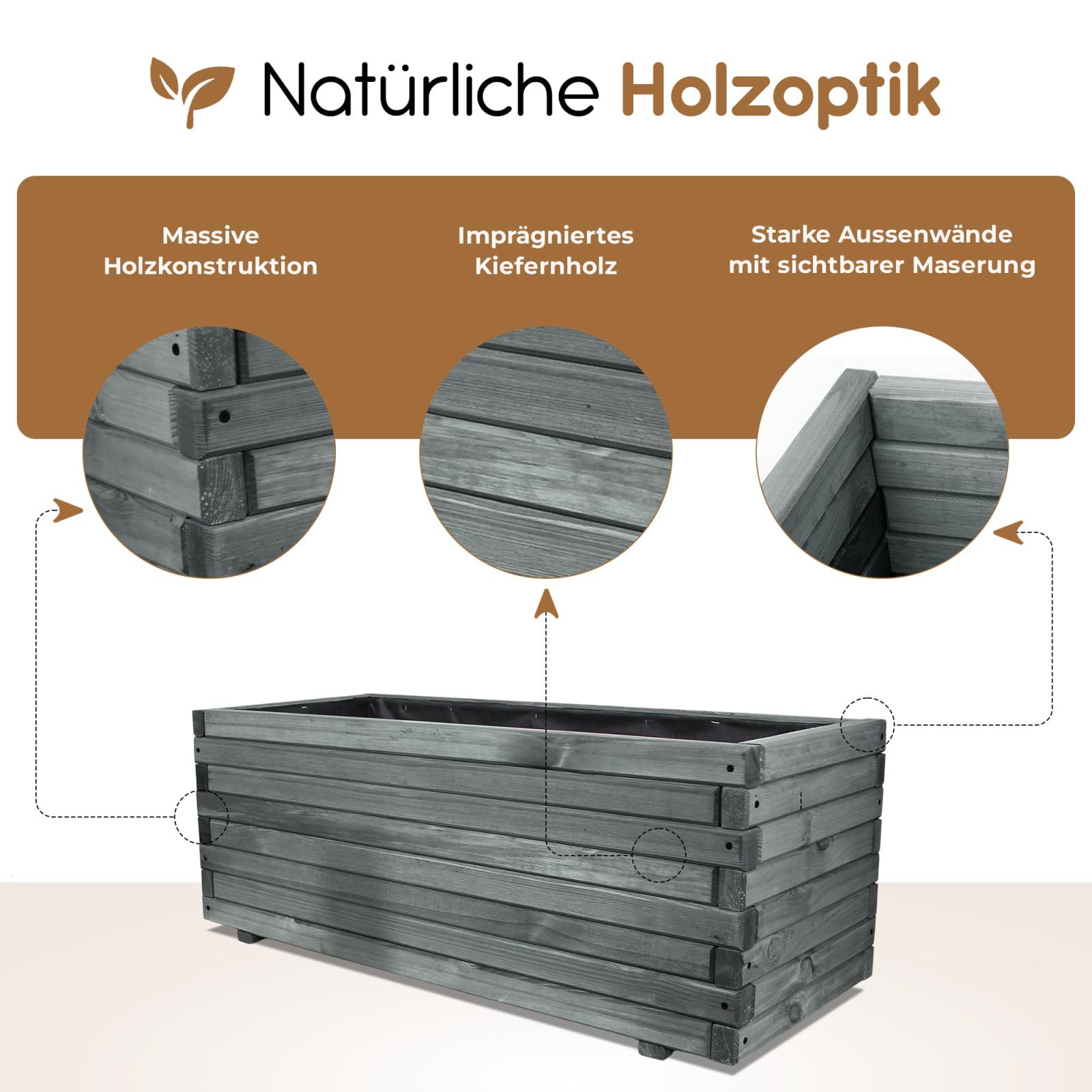 Zur Produktion wurde ausschließlich gut getrocknetes und gehobeltes Kiefernholz mit großen Querschnitten verwendet. Dies verleiht der Konstruktion eine enorme Steifigkeit und verhindert zudem eine frühzeitige Verwitterung. Zusätzlich ist die Blumenkiste mit braunem Imprägniermittel im Tauchverfahren imprägniert, sodass eine grundlegende Witterungsbeständigkeit gegeben ist. Bei Aufstellung im Freien, sollte jedoch regelmäßig ein Schutzanstrich erfolgen.