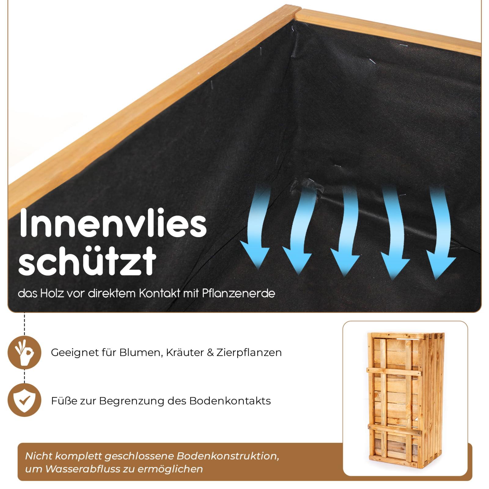 Um den direkten Erdkontakt zu vermeiden, sind unter dem Pflanzkasten 2 Holzstege verbaut, welche für ausreichend Abstand zu stehendem Wasser sorgt.