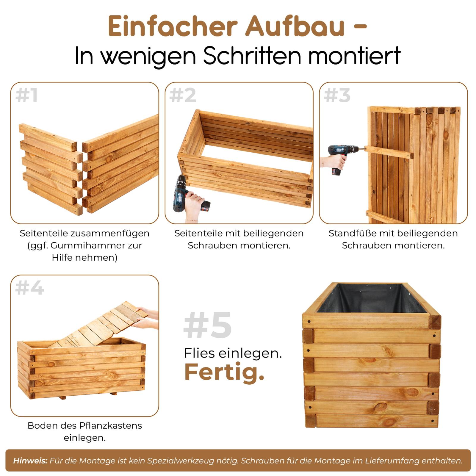 Zur Produktion wurde ausschließlich gut getrocknetes und gehobeltes Kiefernholz mit großen Querschnitten verwendet. Dies verleiht der Konstruktion eine enorme Steifigkeit und verhindert zudem eine frühzeitige Verwitterung. Zusätzlich ist die Blumenkiste mit braunem Imprägniermittel im Tauchverfahren imprägniert, sodass eine grundlegende Witterungsbeständigkeit gegeben ist. Bei Aufstellung im Freien, sollte jedoch regelmäßig ein Schutzanstrich erfolgen.