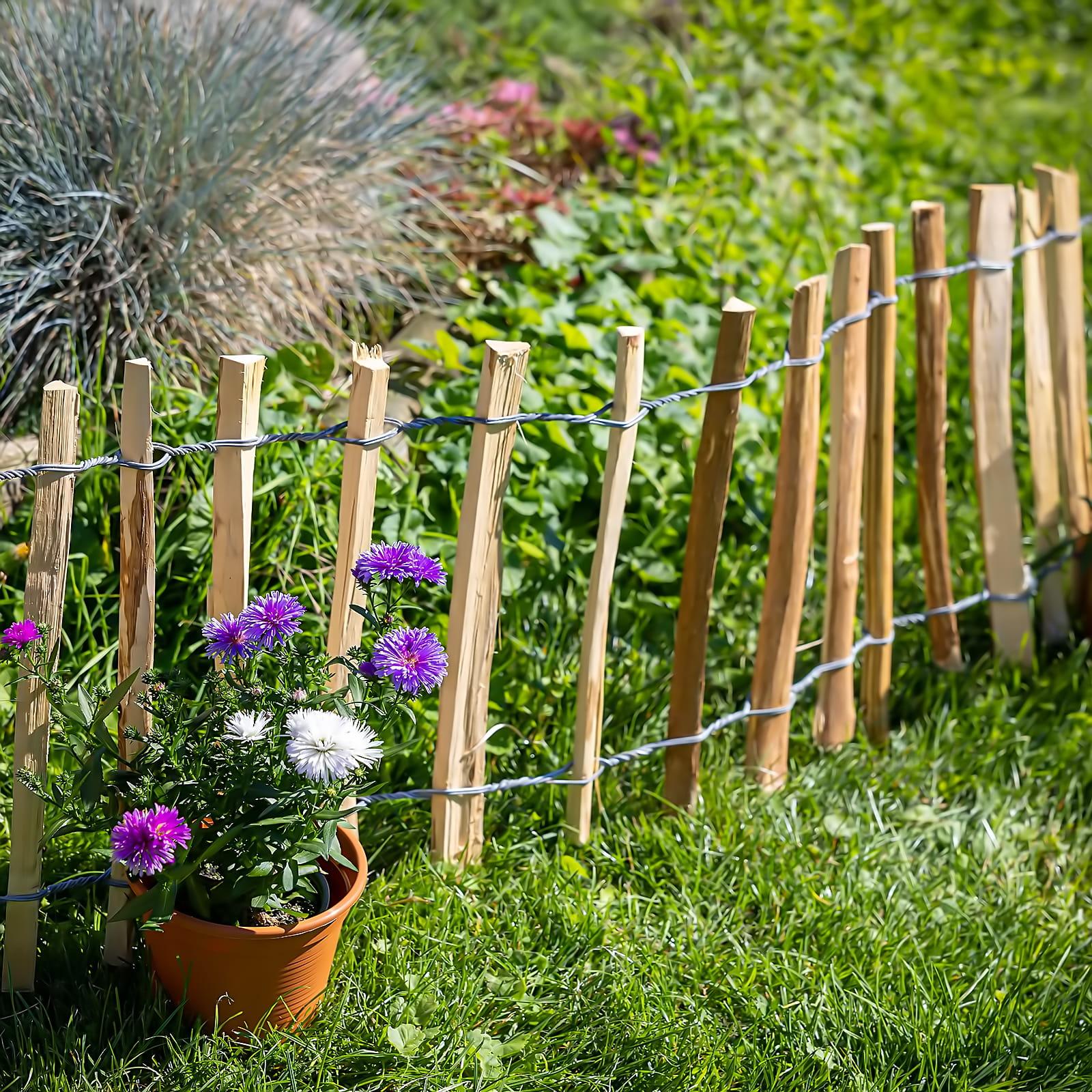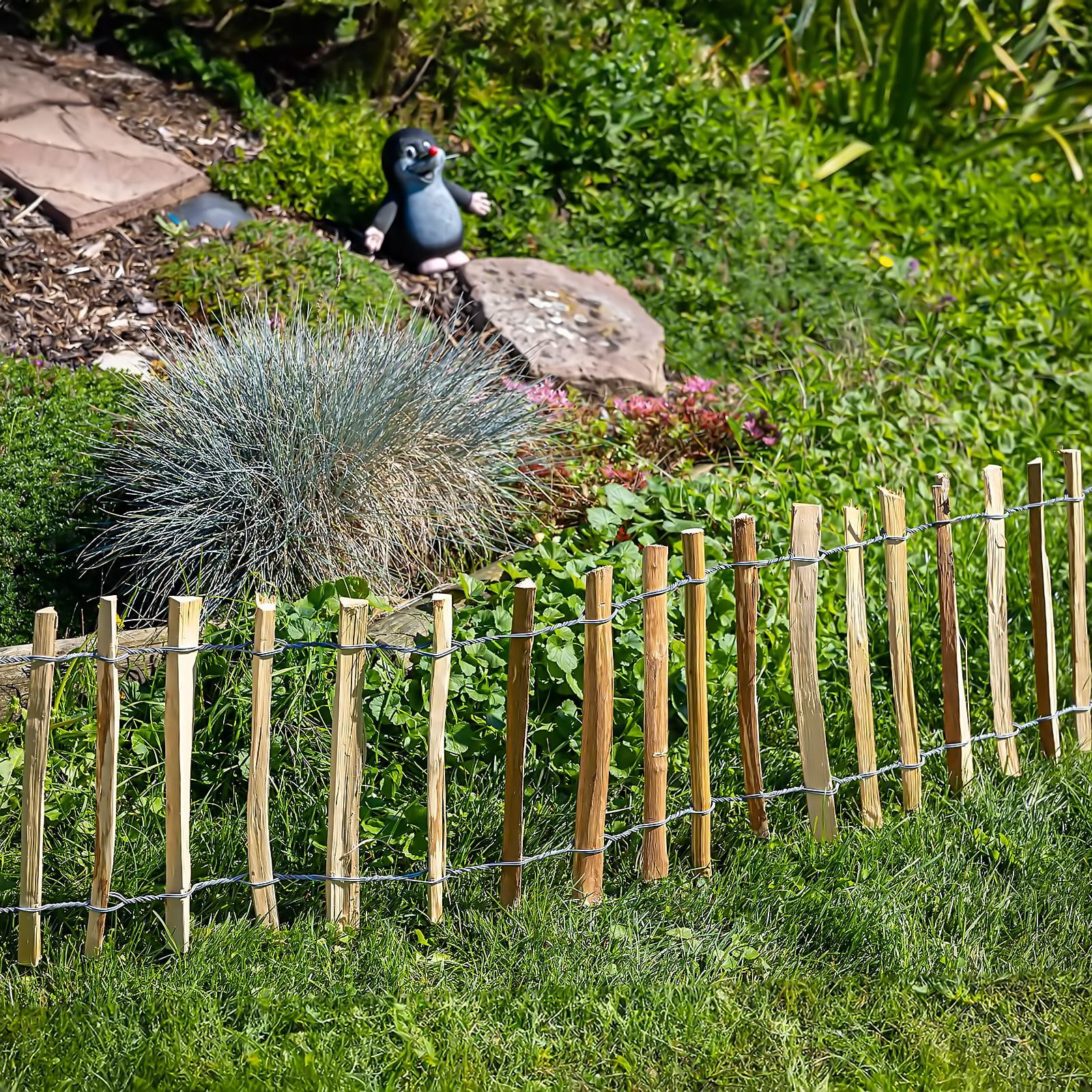Dieser natürliche Staketenzaun (auch bekannt als Rollzaun, Steckzaun oder Kastanienzaun) eignet sich perfekt für Eingrenzungen von Beeten,