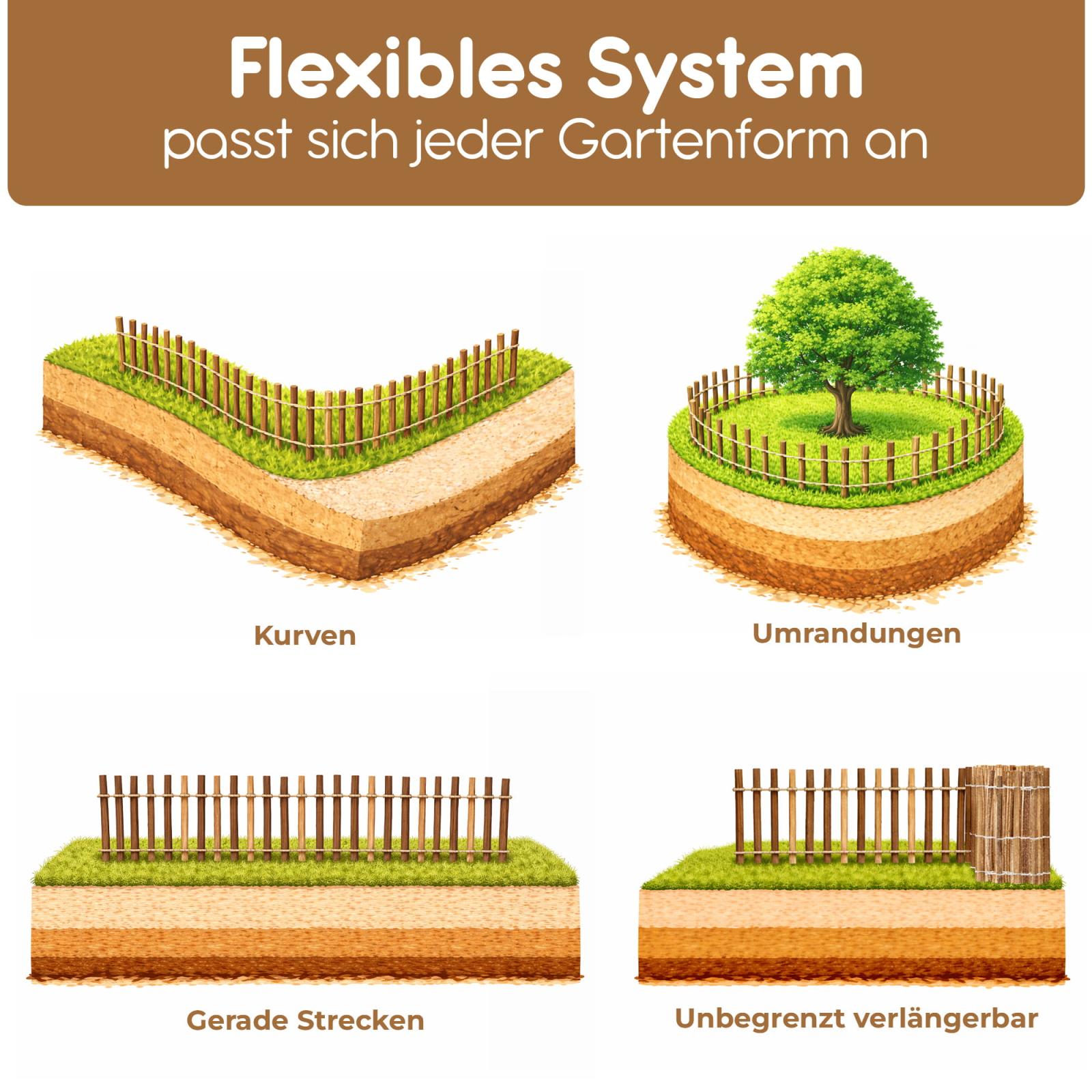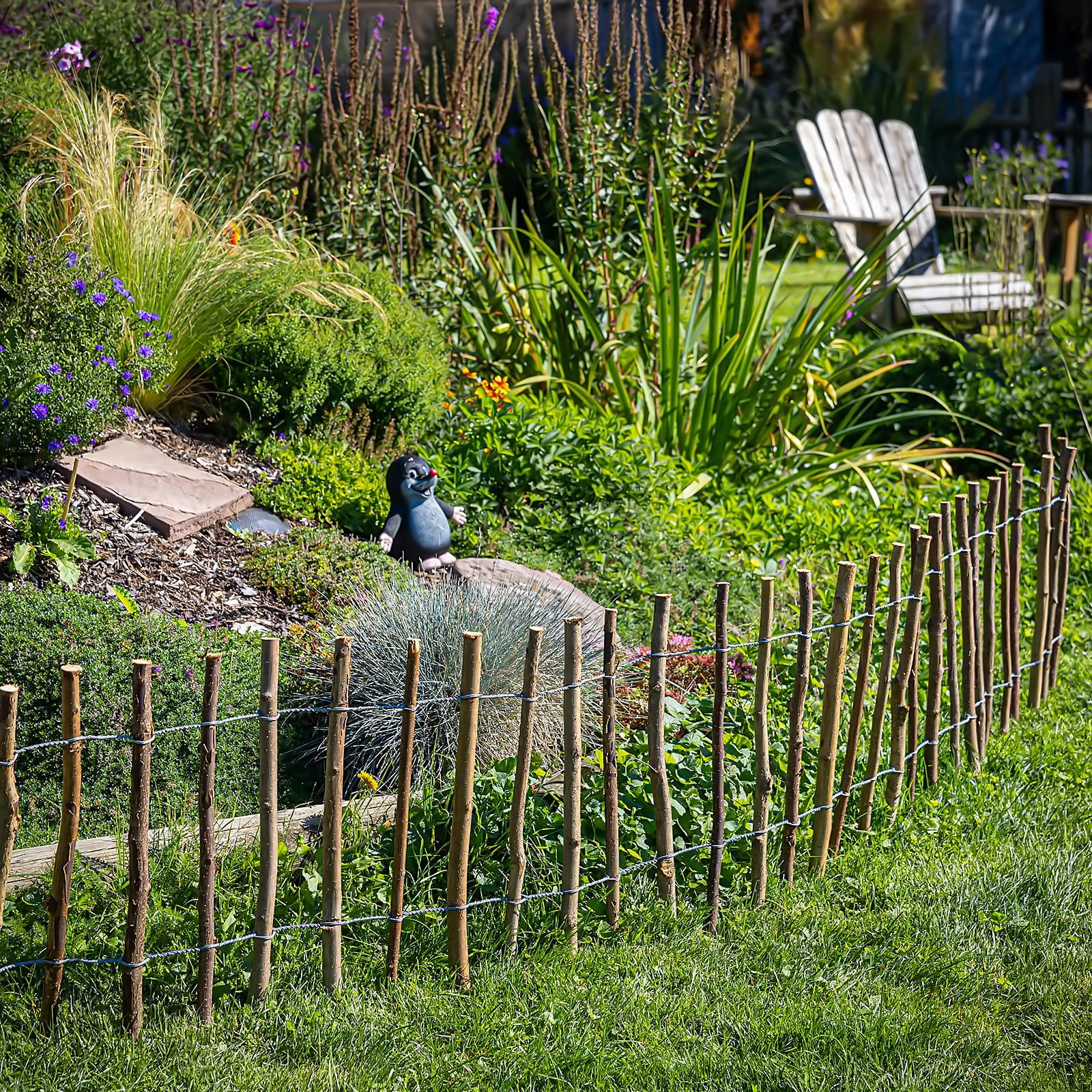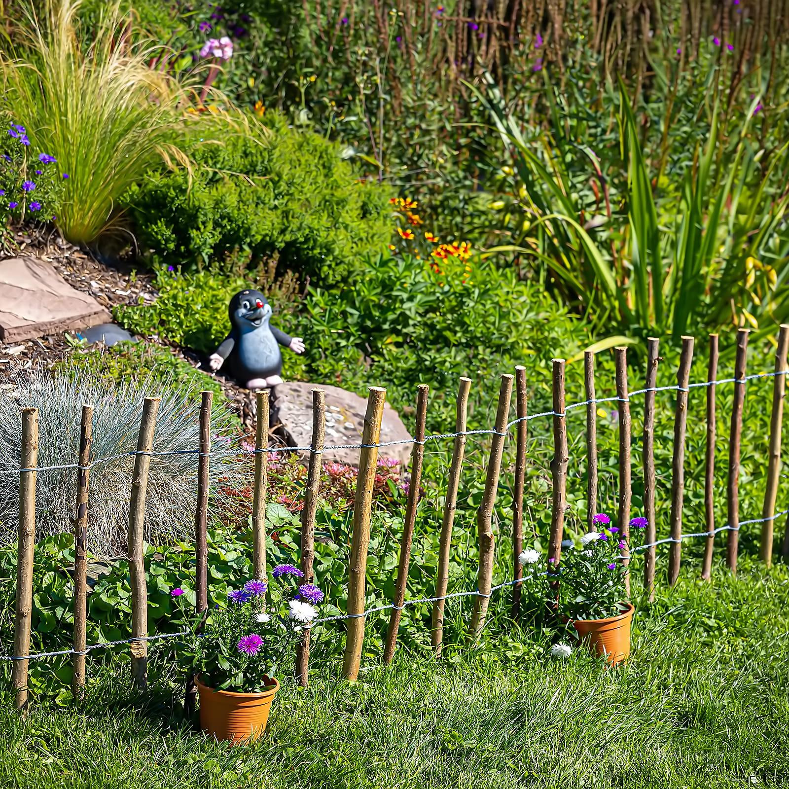 Dieser natürliche Staketenzaun ( auch bekannt als Rollzaun, Steckzaun oder Kastanienzaun ) eignet sich perfekt für Eingrenzungen von Beeten, Laufwegen, Grundstücksgrenzen uvm. Kleine Pflanzen können ihre feinen Äste durch den Zaun hindurchstrecken und sorgen für eine natürlich wirkende Ordnung im Garten. Durch die integrierten Pfosten kann diese Beeteinfassung sehr schnell und unkompliziert aufgebaut werden.