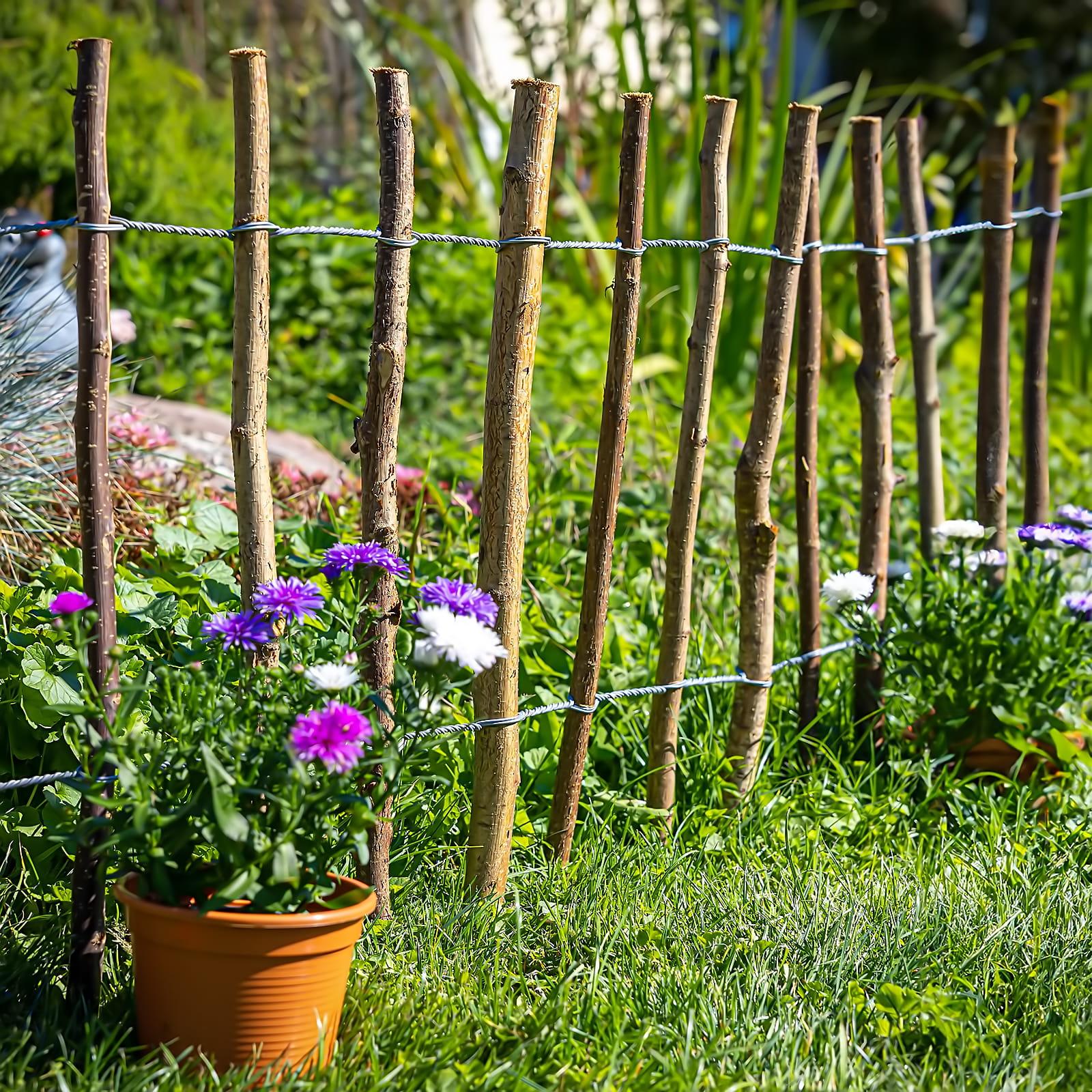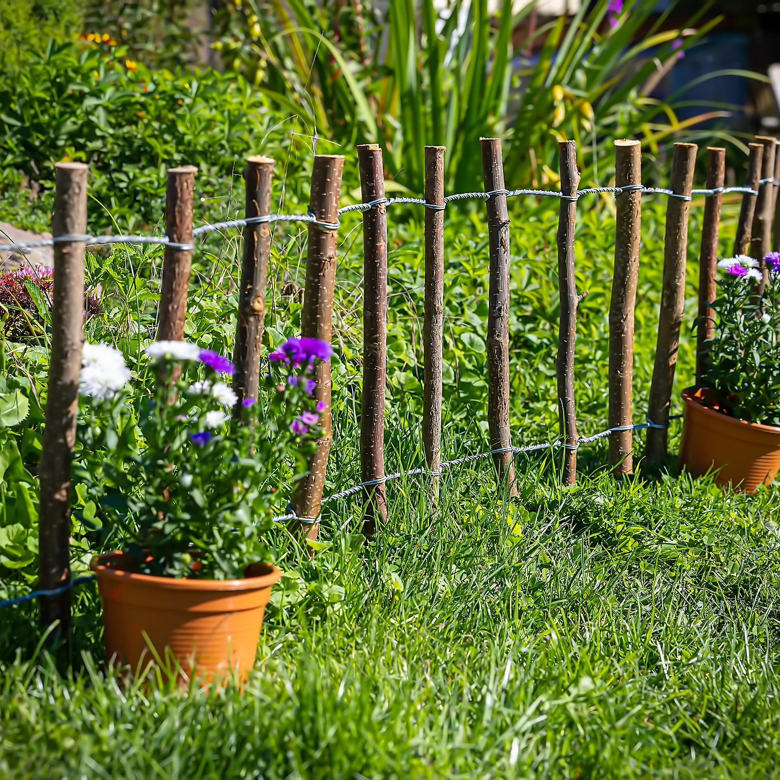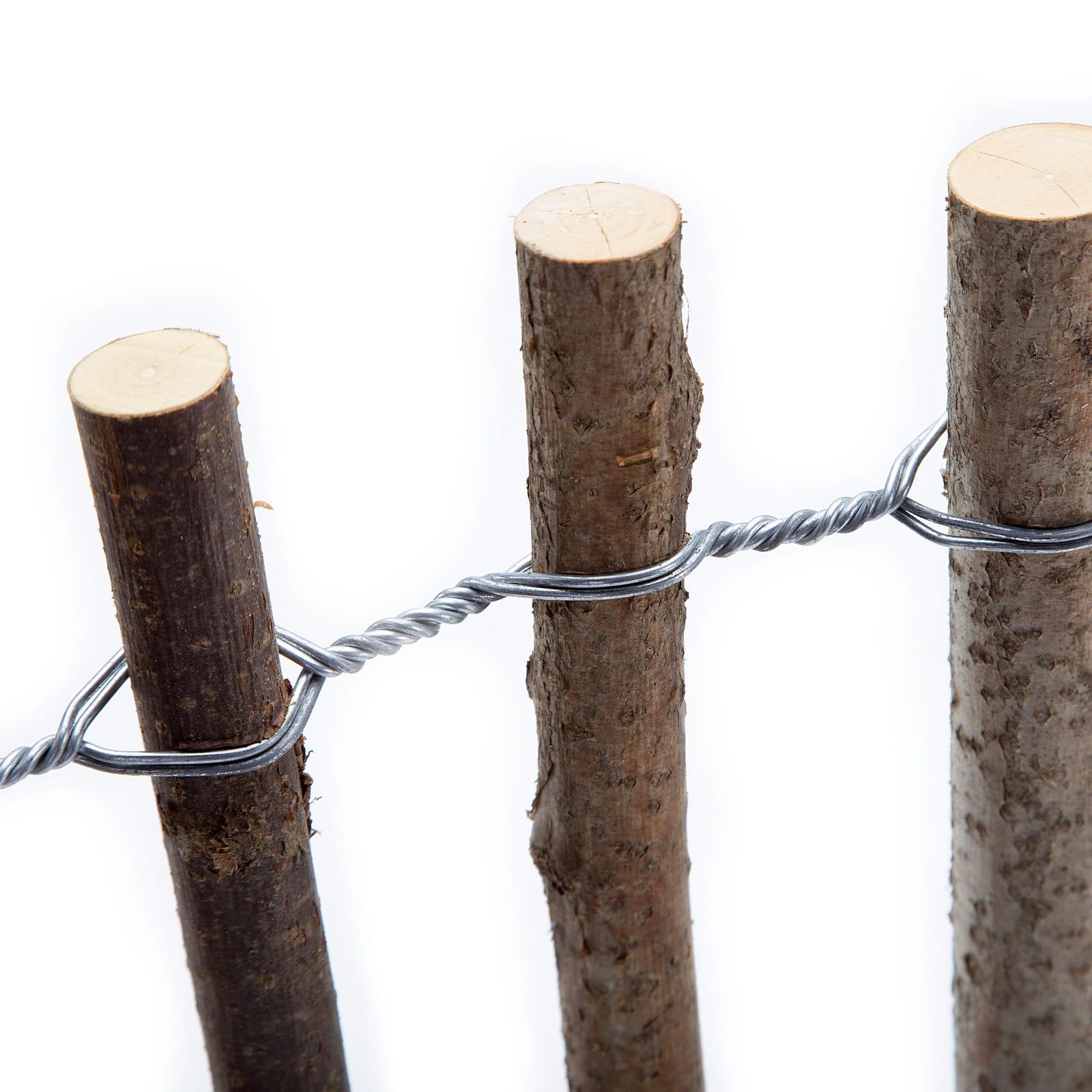 Die Spitzen der Holzlatten sind nach oben hin nicht angespitzt, was für ein Höchstmaß an Sicherheit und eine einladende Optik sorgt. Die Verspannung des Steckzauns besteht aus einem starren, verzinkten Drahtgeflecht, welches für die nötige Stabilität sorgt und eine optimale Formbarkeit ermöglicht. So können Sie ohne zusätzliche Fixierung auch kreisrunde, wellenförmige und eckige Abgrenzungen sehr unkompliziert realisieren. Das unbehandelte Haselnussholz besitzt seinen besonderen Charme und unterstreicht den natürlichen Charakter jedes Gartens.
