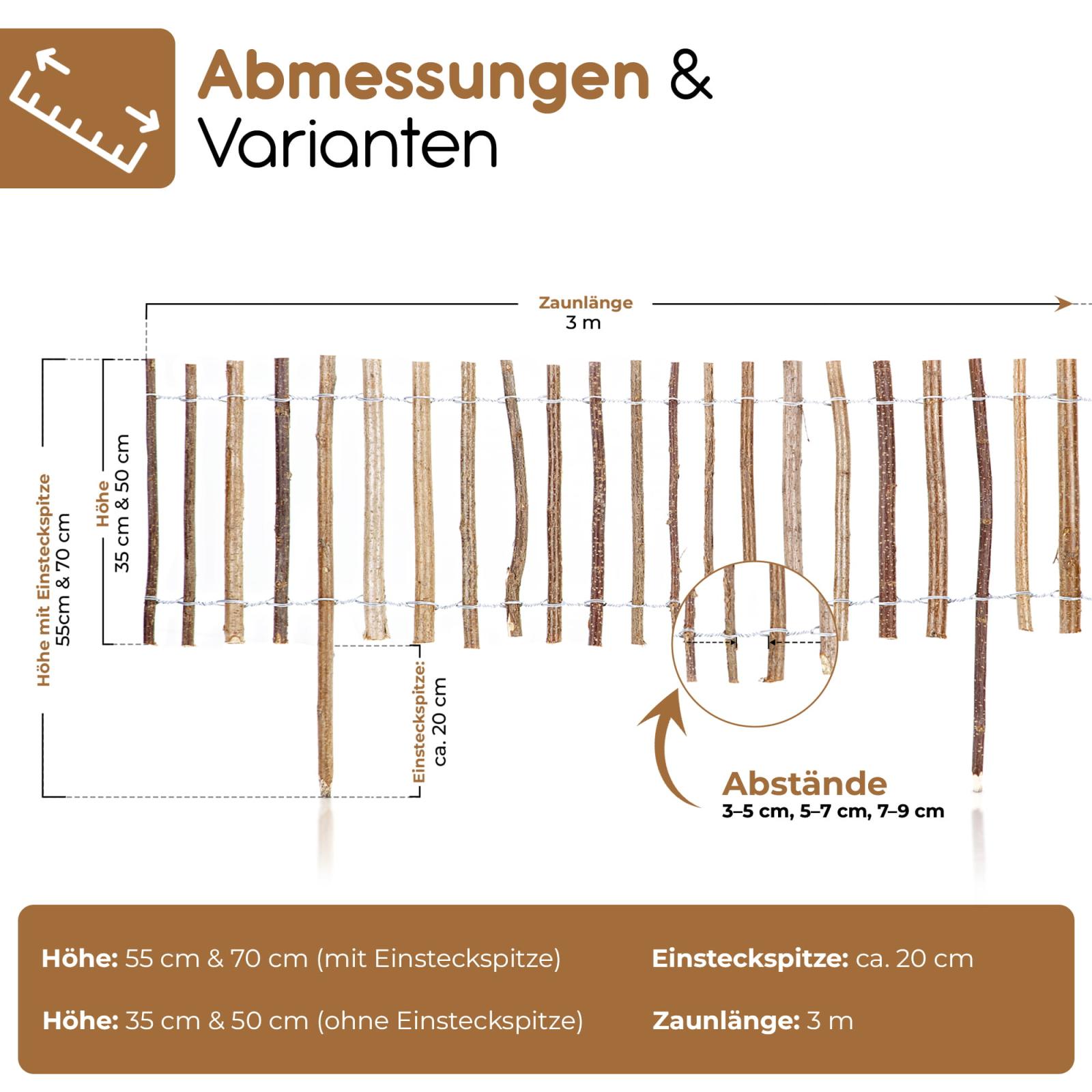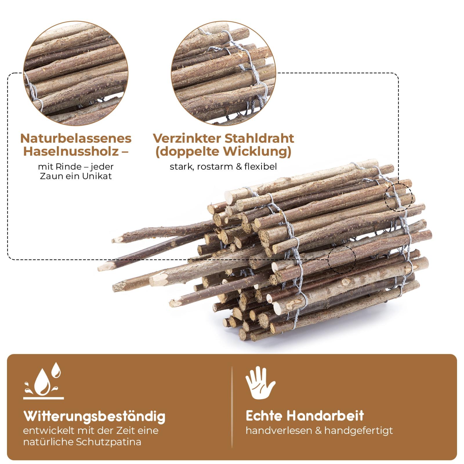 - Hochwertiger Roll-Steck-Zaun aus Haselnussvollholz mit Rinde