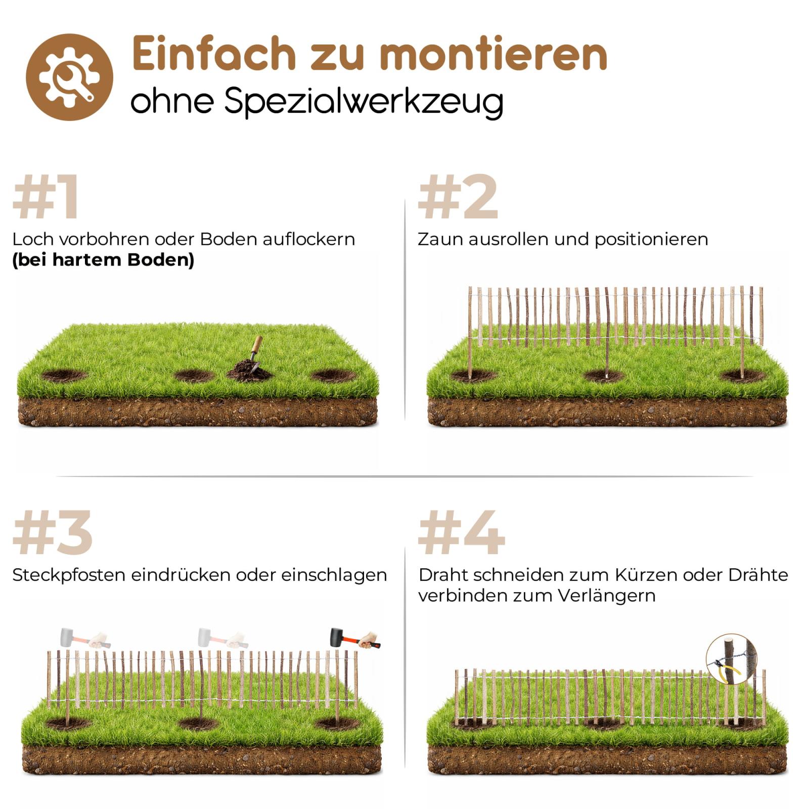 - Zaun ausrollen und Pfosten nacheinander leicht in den Boden stecken