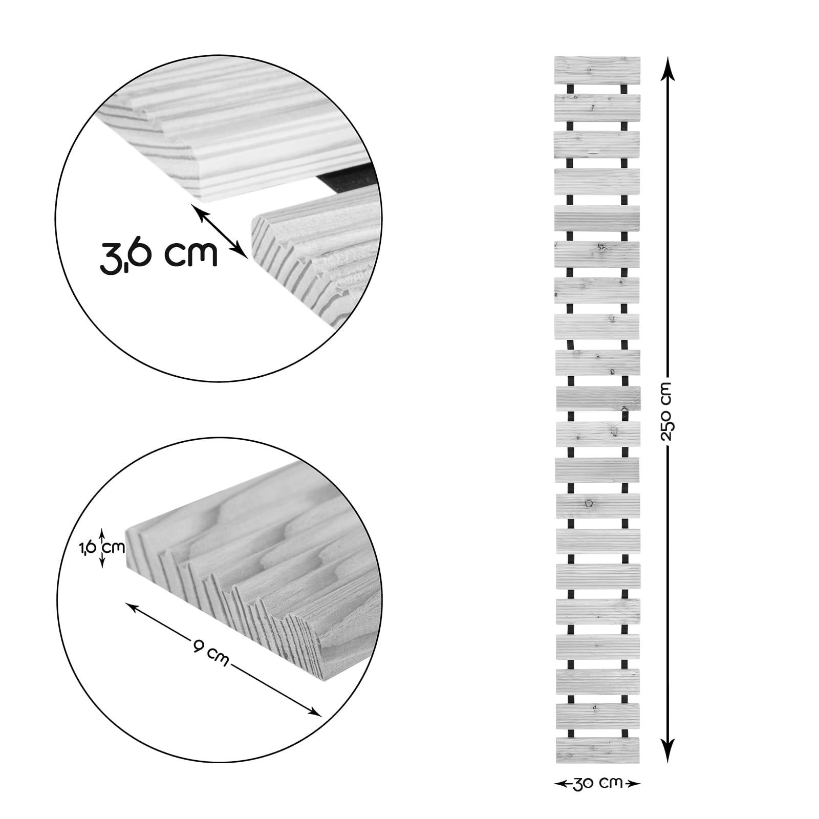 - Die Rollwege sind 250cm lang und in den Breiten 30cm, 40cm und 50cm mit Lattenabstand von 3,6cm oder 8cm erhältlich.