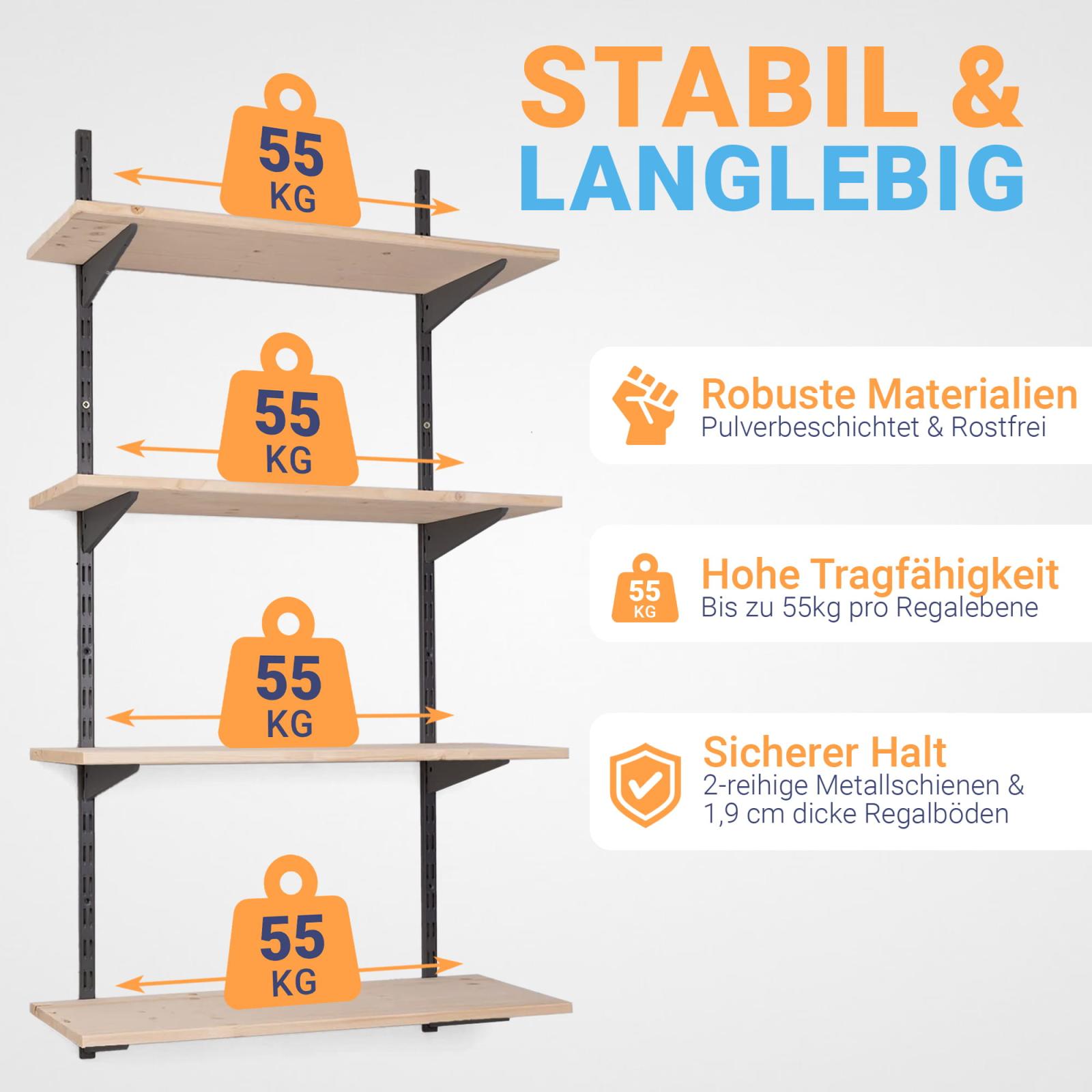- Im Set enthalten sind: Zwei Wandschienen in ausgewählter Länge, Regalträger und Regalböden für die ausgewählte Anzahl an Regalebenen, sowie passend viele Aufsteckhalter mit den entsprechenden Schrauben zur Befestigung am Regalboden.
