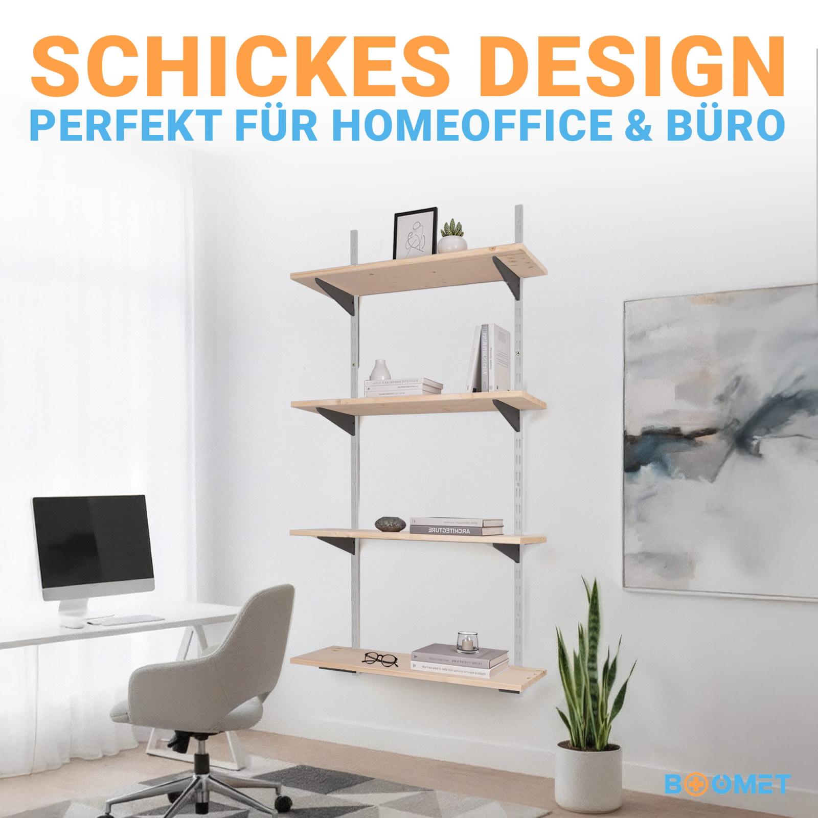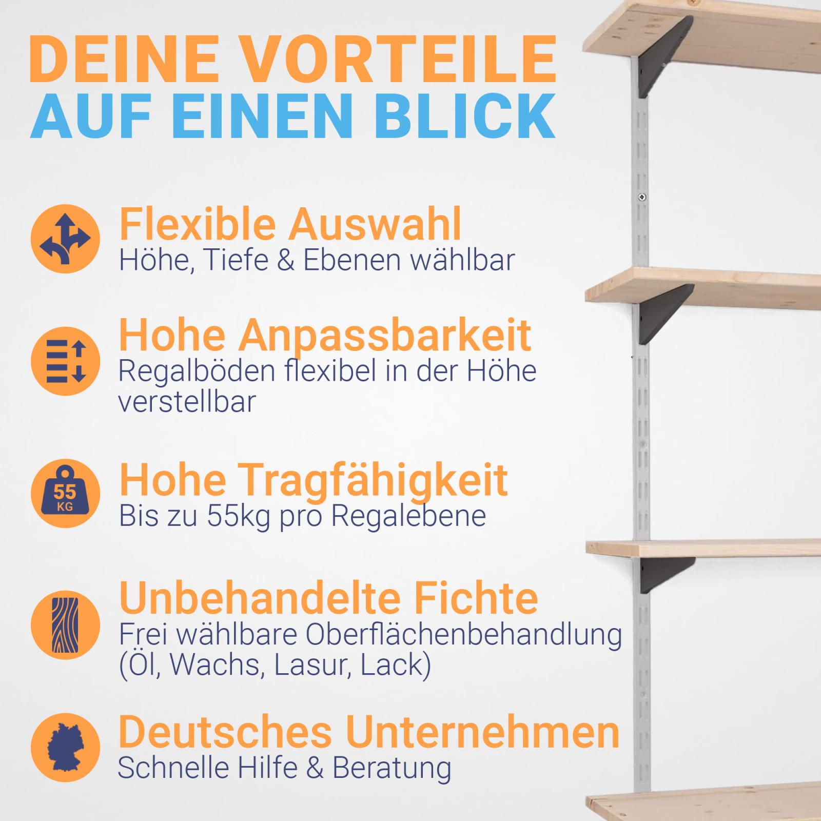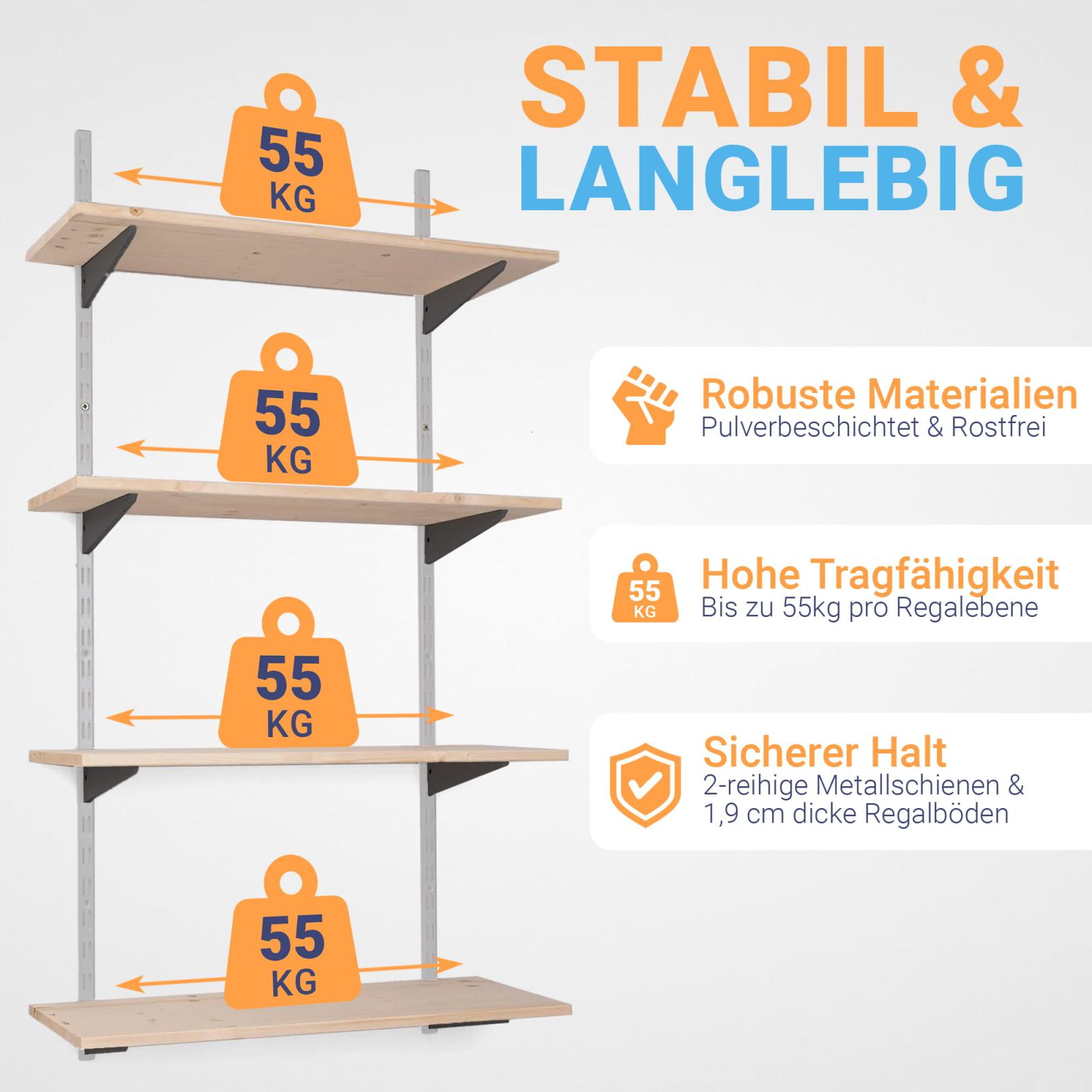 - Im Set enthalten sind: Zwei Wandschienen in ausgewählter Länge, Regalträger und Regalböden für die ausgewählte Anzahl an Regalebenen, sowie passend viele Aufsteckhalter mit den entsprechenden Schrauben zur Befestigung am Regalboden.