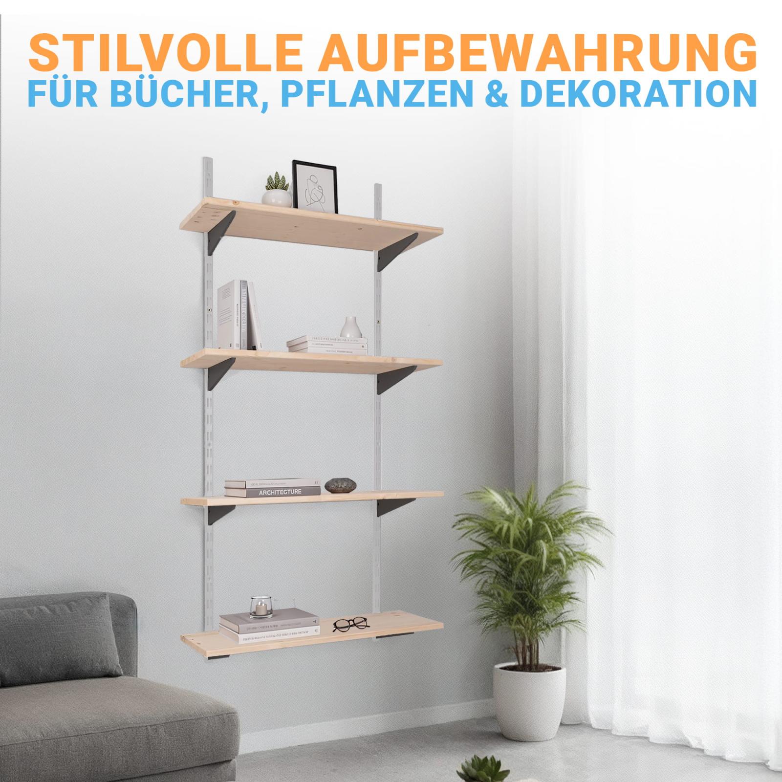 Die Regalschienen lassen sich mit Dübeln und Schrauben, je nach Material der Wand, spielendleicht befestigen. Nutzen Sie auf jeden Fall einen Zollstock und eine Wasserwaage damit Sie das Wandregal am Ende perfekt in Waage haben. Danach können Sie die enthaltenen Regalsystem Träger nutzen und diese in die Regalschienen einhaken. Im letzten Schritt müssen Sie nur noch die beigefügten Aufsteckhalter in die Trägern einstecken und diese mit den Regalböden verschrauben und schon ist Ihr neues Wandregal fertig.