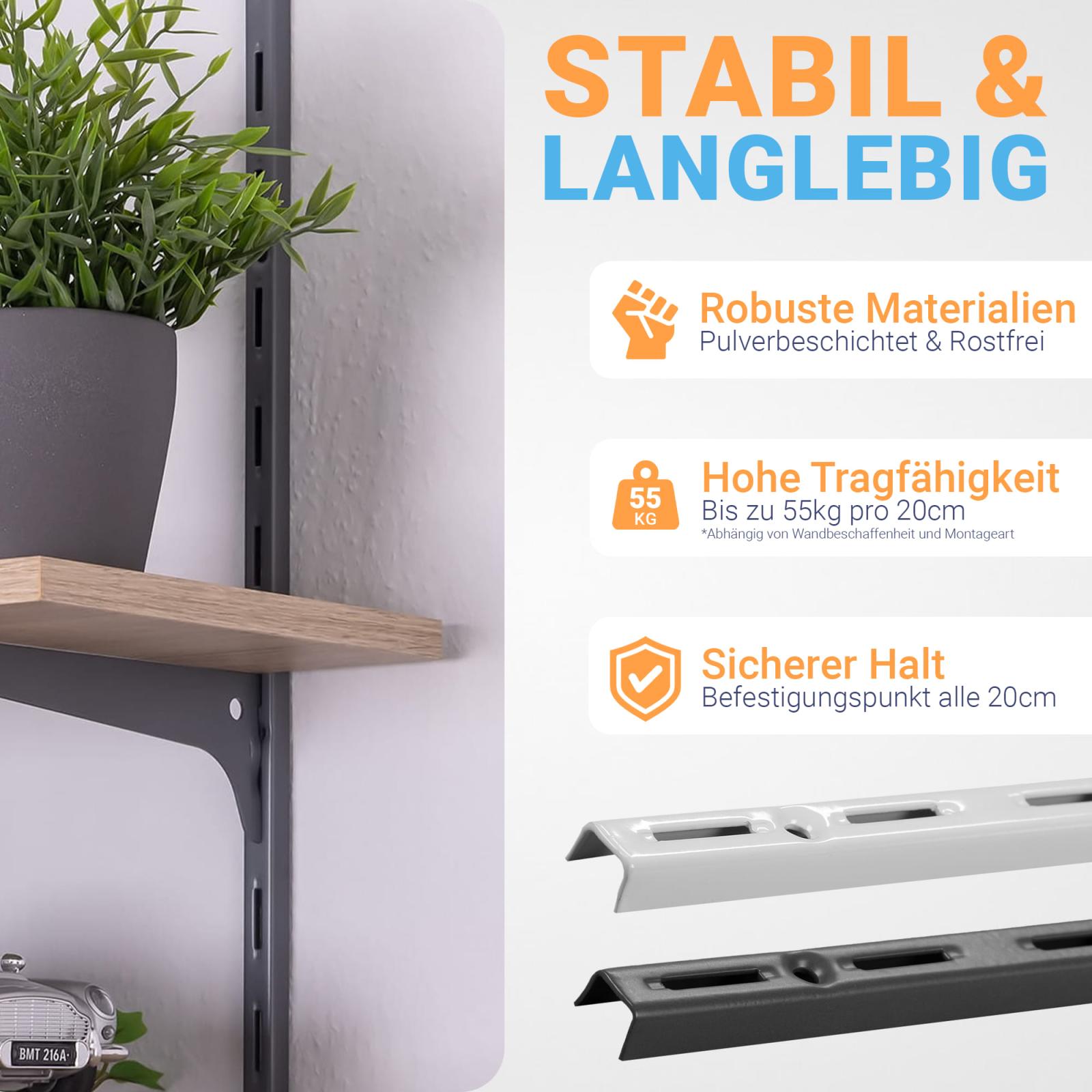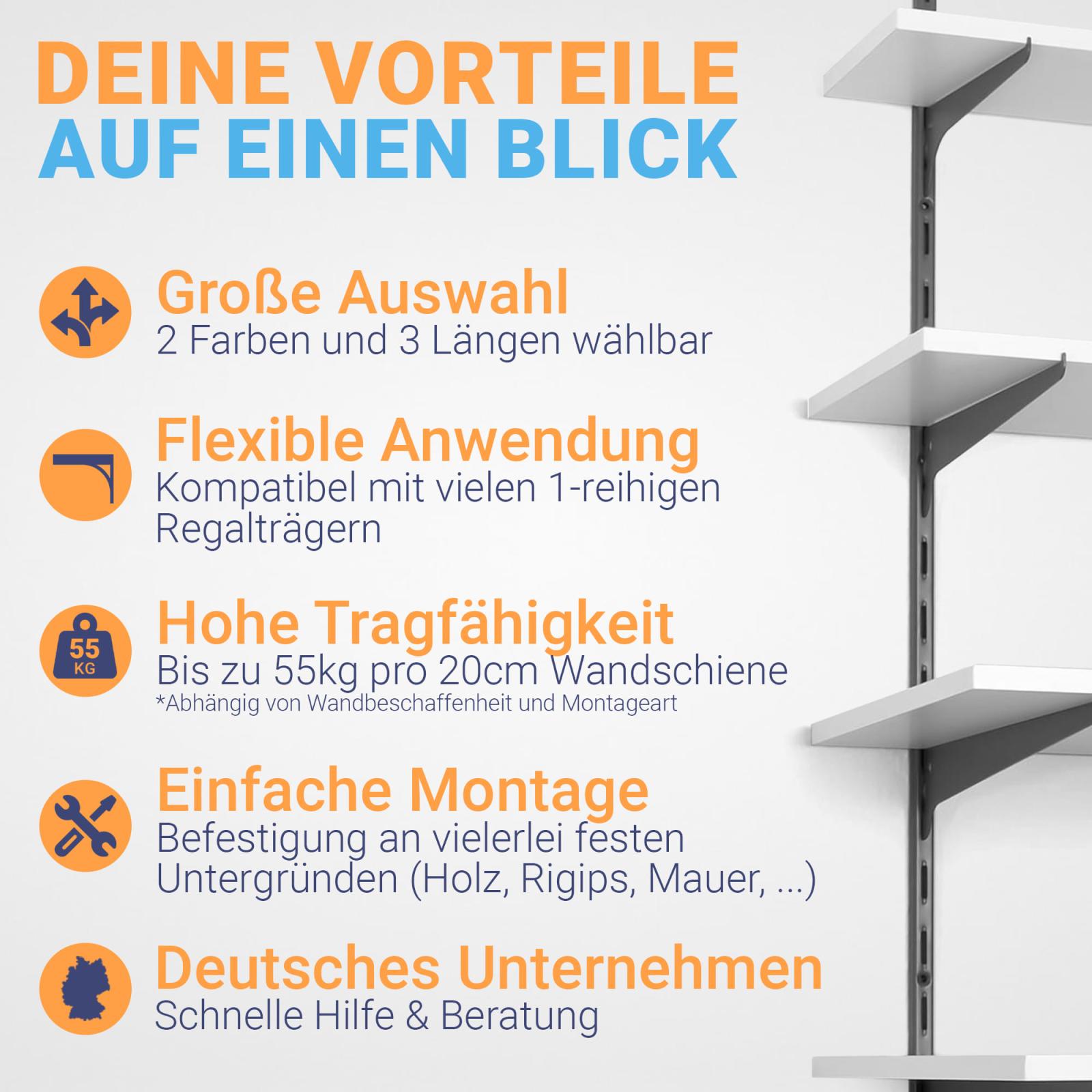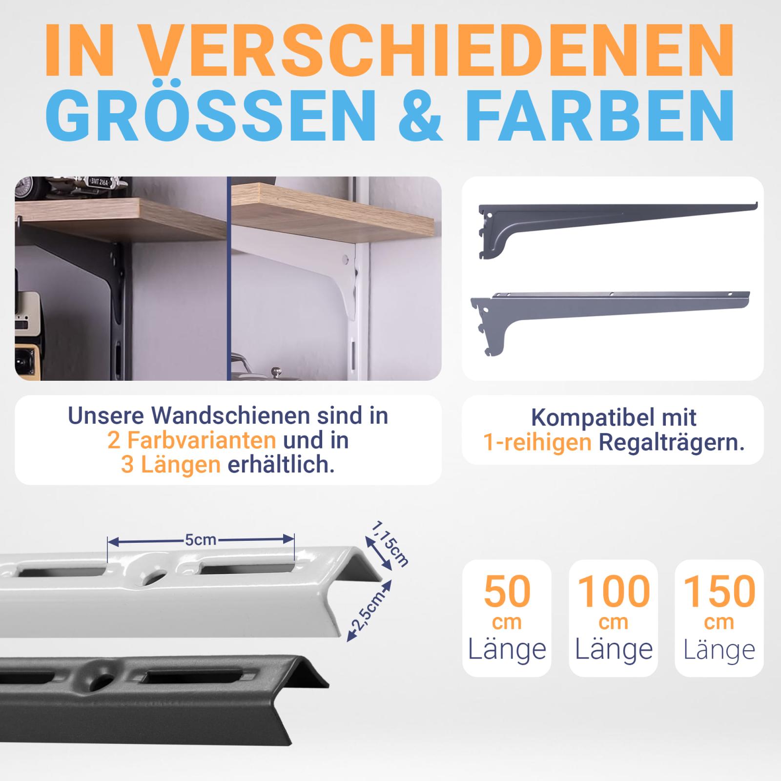 Mit unseren Wandschienen können Sie einfach und schnell Wandregale bauen, Stauraum schaffen und so für Ordnung im ganzen Haus sorgen. Die Regalschienen sind sehr praktisch um Einzelregale für Vorratsräume, Garderoben, Waschräume, Badezimmer, im Büro und in den Werkstätten zu konstruieren. Wandregale selber bauen ist mit diesem Wandregalsystem ohne weiteres möglich und lässt Ihnen viel Spielraum im Bereich Wohnen und Gestalten. Die 1-reihigen Wandschienen sind am besten für Regale geeignet, die aus Regalböden und zwei Schienen bestehen bzw. als Abschluss einer Regalwand an der Seite.
