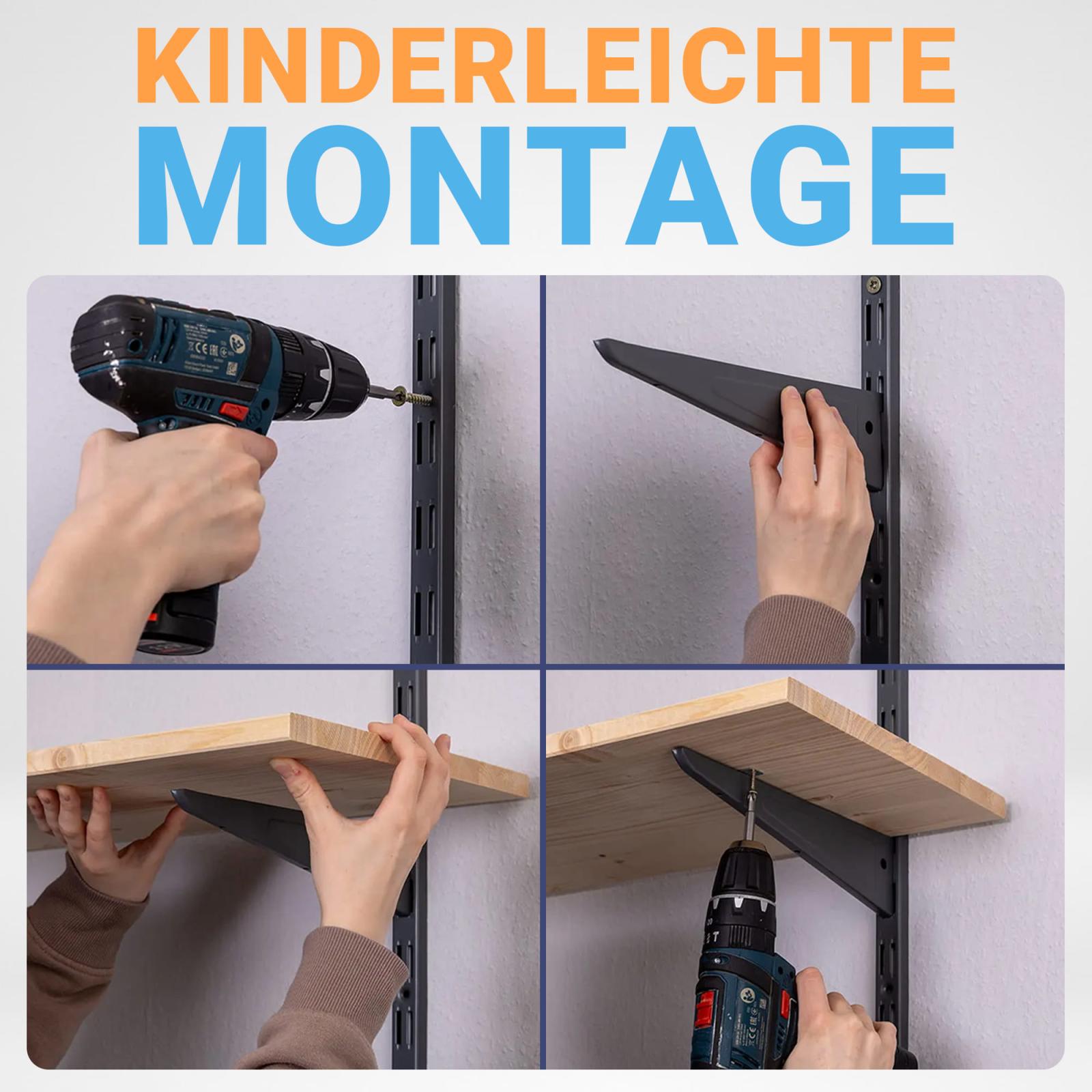 Die Wandschienen lassen sich mit Dübeln und Schrauben, je nach Wandmaterial, kinderleicht befestigen. Nutzen Sie auf jeden Fall eine Wasserwaage und einen Zollstock damit Sie das Regal am Ende perfekt in Waage haben. Danach können Sie mit Regalsystem Trägern arbeiten und diese mit den Regalschienen verbinden. Im letzten Schritt müssen Sie nur noch den Regalboden auf den Trägern befestigen und schon ist Ihr neues Wandregal fertig.