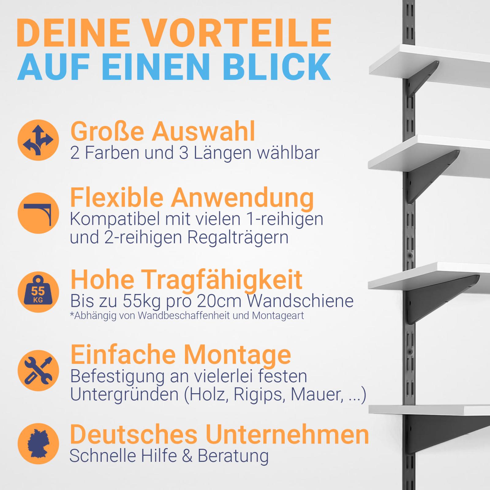 Mit unseren Regalschienen können Sie schnell und einfach Regale für die Wand bauen, Platz schaffen und so für Ordnung im Eigenheim sorgen. Die Wandschienen sind sehr praktisch um Einbauschränke, Garderoben oder Wandregale für Vorratsräume, Keller, Waschräume, Badezimmer, in den Werkstätten und im Büro zu konstruieren. Mit diesem Wandregalsystem ist Wandregale selber bauen ohne weiteres möglich und lässt Ihnen viel Spielraum im Bereich Wohnen und Gestalten. Die 2-reihigen Regalschienen sind am besten für Regale geeignet, die aus Regalböden und zwei Schienen bestehen bzw. als Abschluss einer Regalwand an der Seite.
