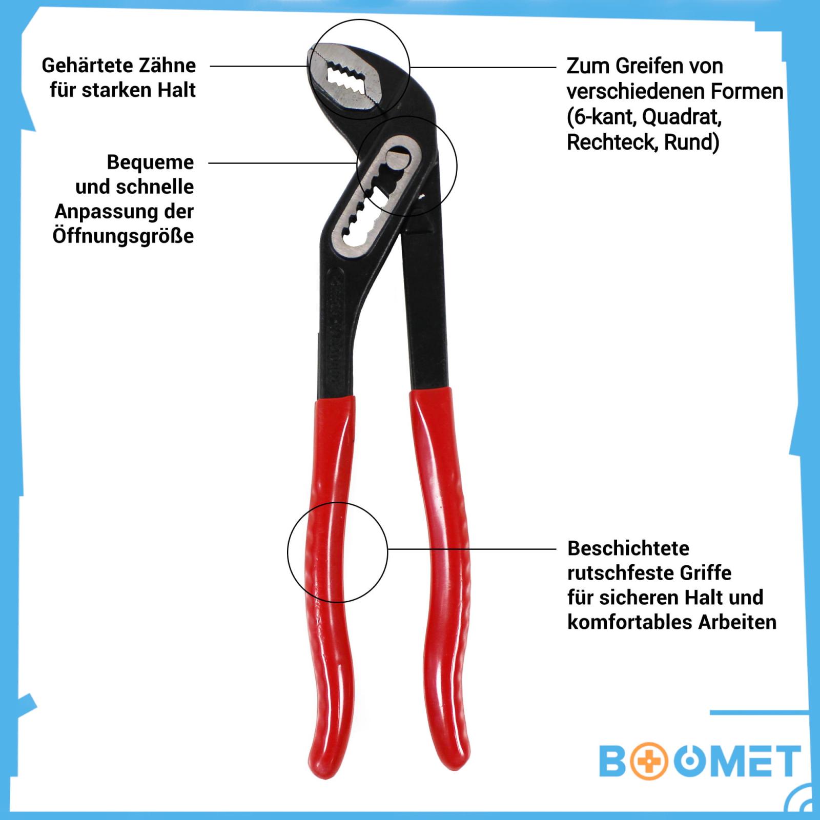 Diese Wasserpumpenzange vereint Robustheit mit Präzision. Der gehärtete Stahl verleiht ihr außergewöhnliche Stabilität, während die ergonomischen, rutschfesten Griffe ein komfortables Handling gewährleisten. Ob bei der Installation von Rohren, dem Greifen von Armaturen oder dem Einsatz im Zangenset die BOOMET Wasserpumpenzange ist vielseitig und zuverlässig. Ihr leichtes, kompaktes Design macht sie zudem zum idealen Werkzeug für unterwegs.