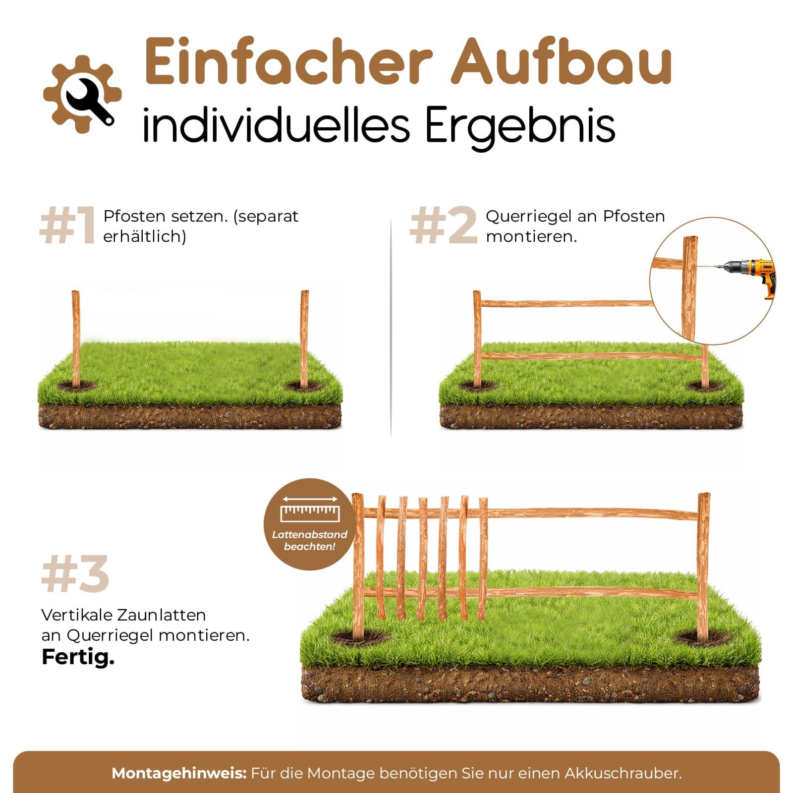 Wählen Sie einfach die gewünschte Höhe und Länge Ihrer Zaunelemente. Sogar den Abstand der einzelnen Latten können Sie selbst bestimmen. Wir liefern Ihnen dann die passende Anzahl an Zaunbrettern, Querriegeln und Schrauben inkl. einer Aufbauanleitung.