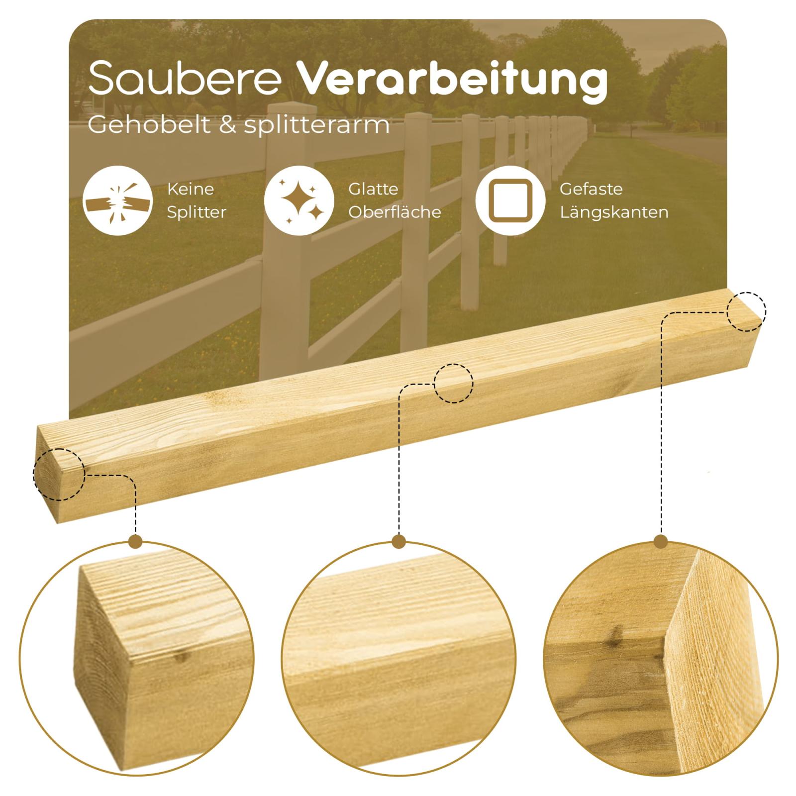 Unsere Holzpfähle bestehen aus robustem Kieferholz, welches mit einer hochwertigen Kesseldruckimprägnierung (KDI) veredelt wurde. Alle Flächen sind glatt abgehobelt, sodass keine Splitter oder Unebenheiten den Anblick trüben. Der flache Kopf ermöglicht das Aufsetzen einer Pfostenschutzkappe, um einen zusätzlichen Schutz vor eindringendem Wasser zu erhalten. Die Kanten der Holzpfähle sind seitlich angefast / abgeschrägt und sorgen dadurch für ein harmonisches Gesamtbild.