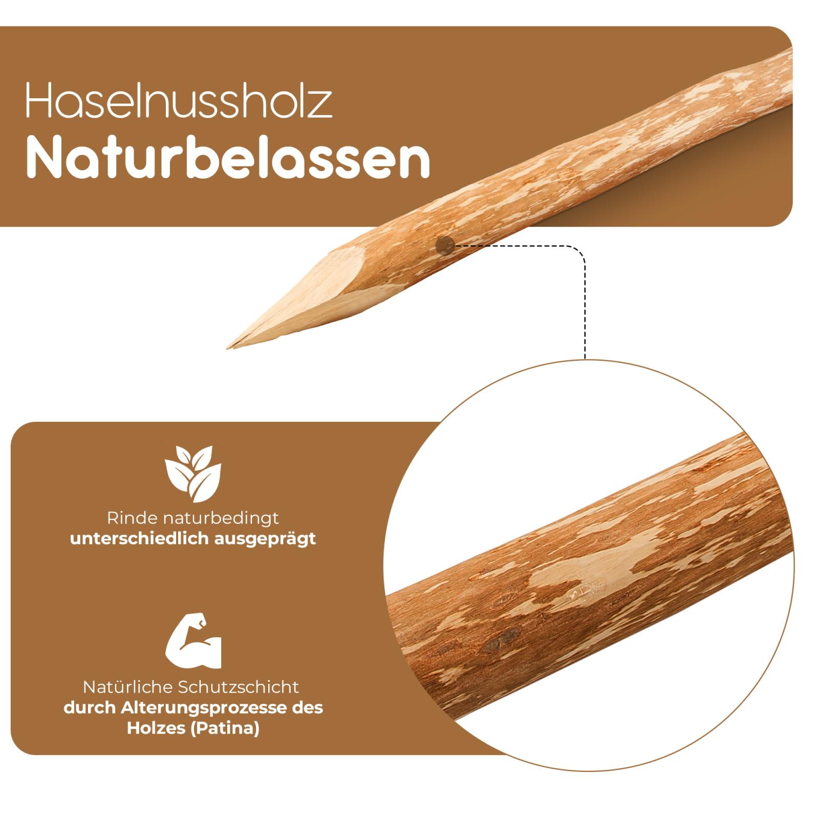 Unsere Haselnussholz-Zaunpfosten werden in mühevoller Handarbeit gefertigt. Die geschälten und angespitzten Haselnusshölzer werden einfach mit der spitzen Seite in den Boden getrieben. Ob als Gartenzaunpfosten, Rankhilfe oder einfach nur als exotischer Blickfang. Unser dekorativer Haselnuss-Zaunpfahl bietet viele Einsatzmöglichkeiten.