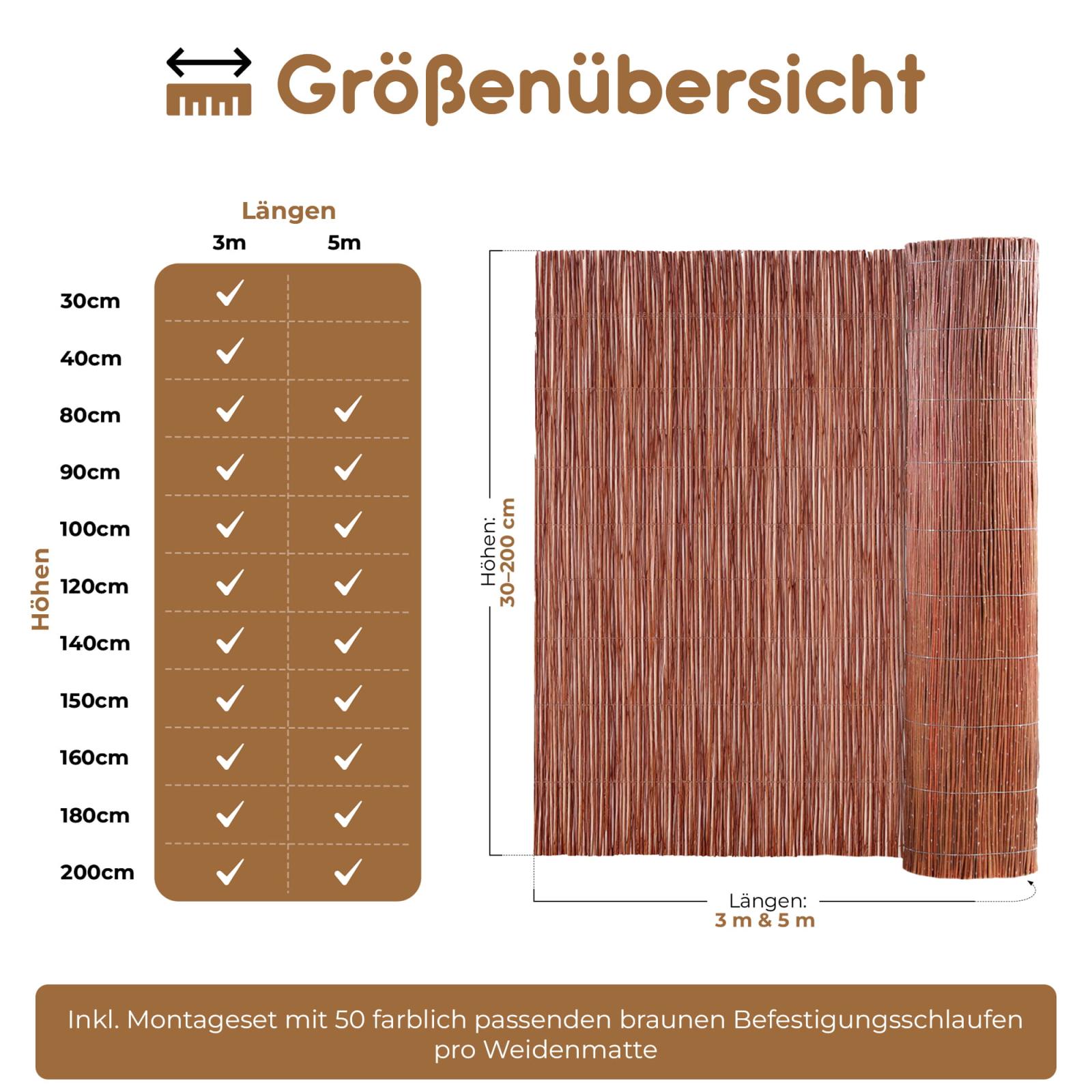 Unser Weidenzaun ist ein vielseitig verwendbares Naturprodukt. Sie erhalten unsere Naturmatte aus Weidenzweigen in vielen verschiedenen Höhen und Längen.