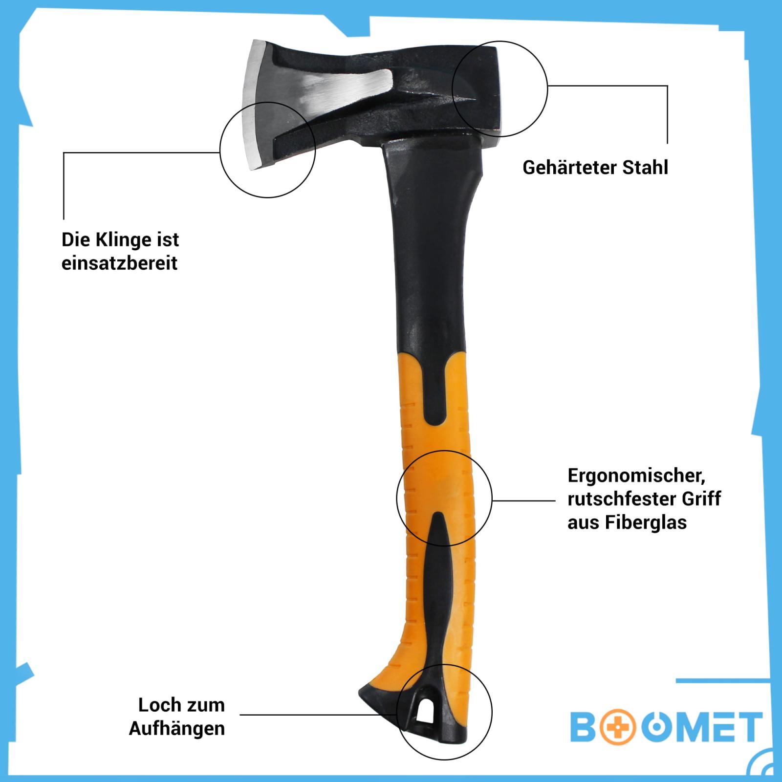 Die BOOMET Spaltaxt vereint Langlebigkeit, Funktionalität und Komfort in einem praktischen Werkzeug. Sie ist ideal für das Spalten von Brennholz, Gartenarbeiten oder Outdoor-Aktivitäten wie Camping. Durch ihre hochwertige Verarbeitung und den robusten Axtkopf ist sie ein zuverlässiger Begleiter für Heimwerker und Profis.