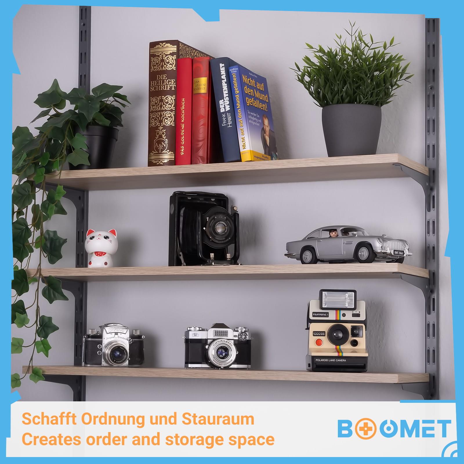 Die Regalträger lassen sich ganz einfach in die Wandschienen einrasten und sitzen dann perfekt darin verankert. Als letztes müssen Sie nur noch den passenden Regalboden auflegen, verschrauben und fertig ist Ihr neues Wandregal.